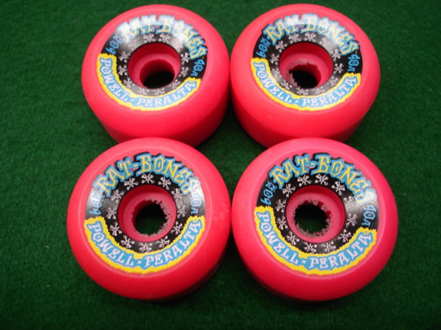 When I first started skating in the 80’s wheels were mostly 60mm, 95a, conical shape and some kind of neon color, usually pink. That was basically the 80’s in a nutshell and skateboarding was no exception. I loved the shapes and colors of wheels back then but things were changing, wheels were getting smaller. In the late 80’s when street skating was about to blow up a 57mm thinner harder wheel was becoming the norm. By the time the 90’s were in full swing wheels were becoming ridiculous and so were the pants. Wheels were like bearing covers, they were terrible and if you rode anything bigger than a 52mm you must have been a vert skating jock! Big wheels were not cool. By mid 90’s things evened out, 52-54mm were deemed acceptable by the skate world, no colors though and all the same shape! Probably the same shape wheel you are riding now. If you had colored wheels you were very different. This thought blows me away, how could wheels be the same shape for so long? Nobody seemed to care or notice? I certainly didn’t, until they started selling re-issue old school wheels. Powell Peralta was one of the first companies that started selling re-issues. G-bones and rat-bones were some of the best wheels ever made. These wheels were more for cruising though. The reason wheels haven’t changed much is because a huge amount of tricks incorporate some kind of slide, this is why the durometer of wheels are generally 99a-101a being the hardest. A popular durometer for cruising is 78a. Still that’s no excuse for wheels having the same bubble shape for so many years. I’m happy to see some really different wheel shape, colour and durometer coming out, it keeps skating refreshing and fun.