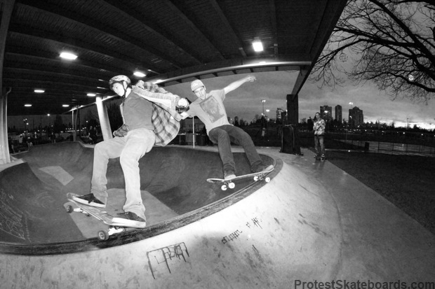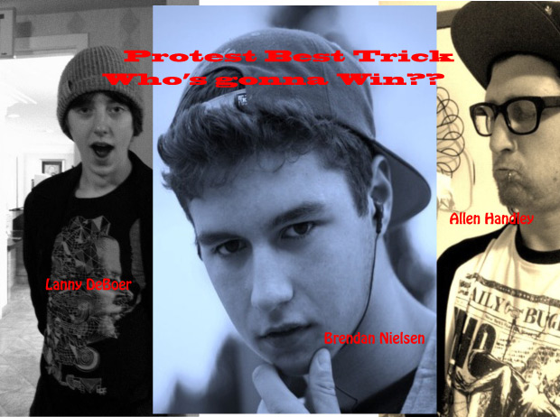 It was a great contest and I’d say majority of the tricks entered were definitely sick tricks. Some were big, some were tech, some were just weird, but all were awesome. You, the public, narrowed down the Top 10 by voting for your favourites, and then it was Team Protests turn to decide the winner. We narrowed it down to the Top 3 with Allen Handley’s Miller Flip over the fireplace at Chuck Bailey, Brendan Nielsen’s Smithgrind Hardflip on the ledge at White Rock Res, and Lanny DeBoer’s Frontside Kickflip 360 over a big wedge gap in the streets. All 3 of these tricks were super unique in their own ways but we were forced to choose just one. After lots of debate back and forth and asking the opinion of a couple outside sources it was confirmed…