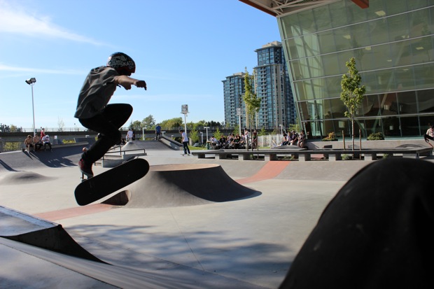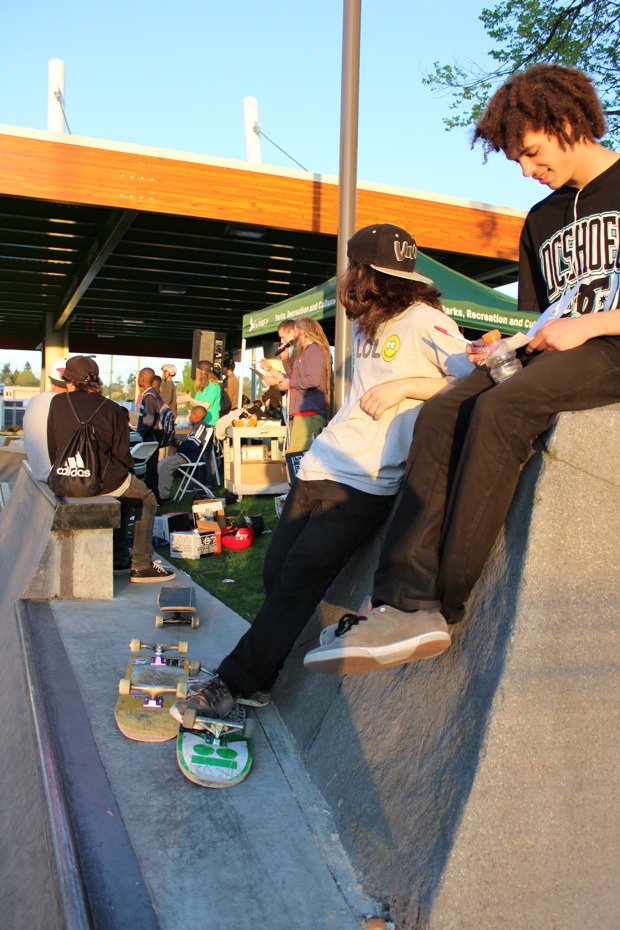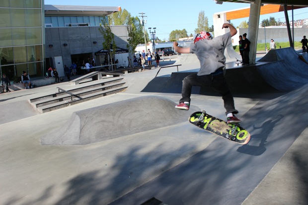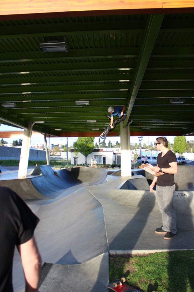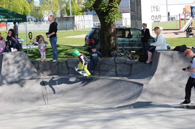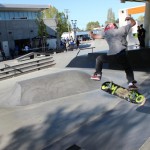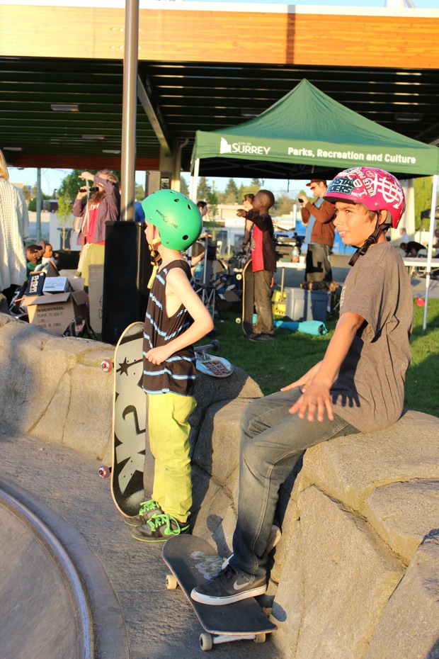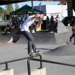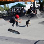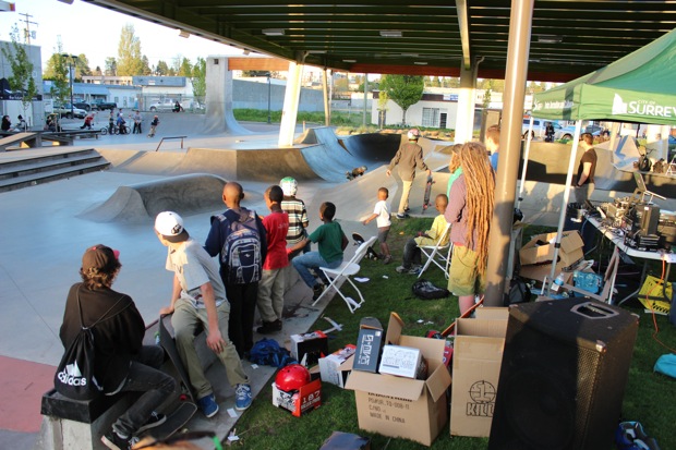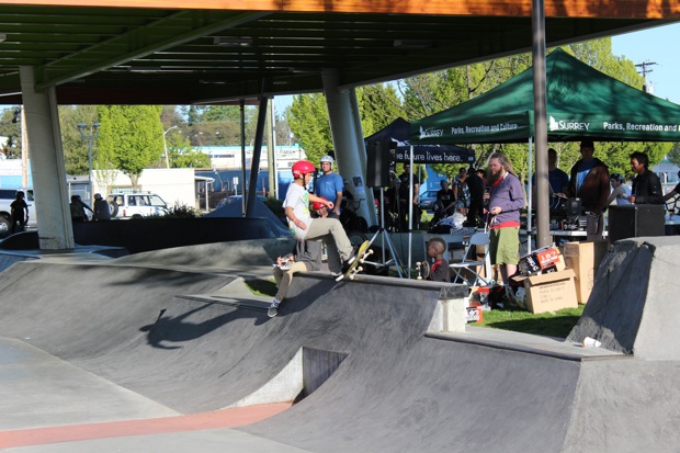 Everyone was invited and lots showed up. There were some Best Trick Comps for the different age groups and Mike handed out a bunch of prizes, but mostly it was just about hanging out together with some tunes blastin’ and having a good time. Amazing job once again for the City of Surrey building a Skate Park with a covered section, proving the opportunity for another successful event that ran while the rain was pouring down. It’s a luxury to have.