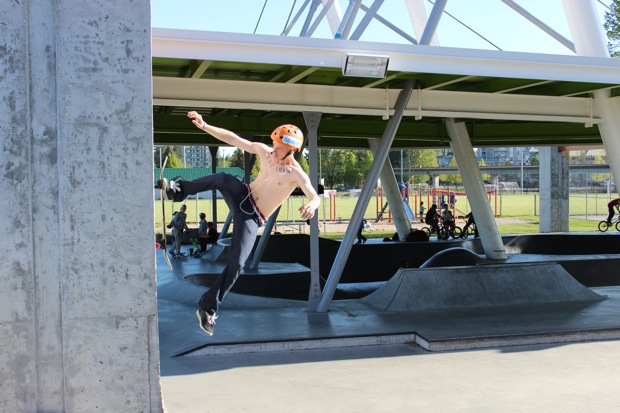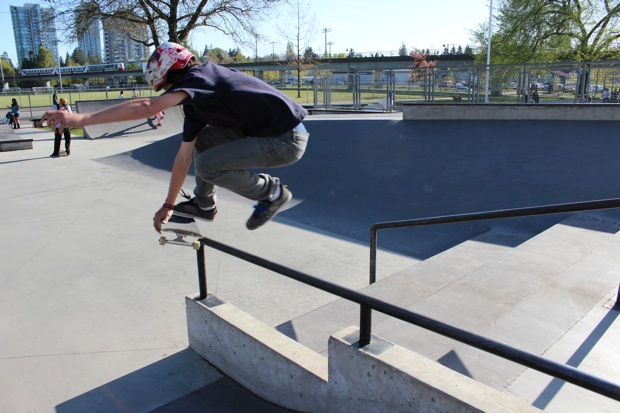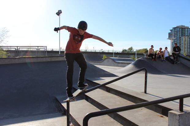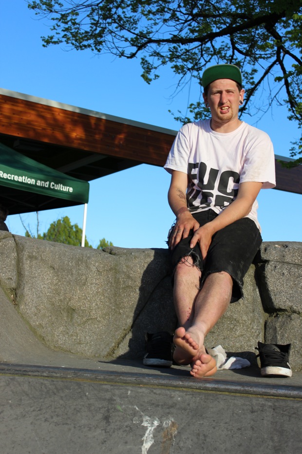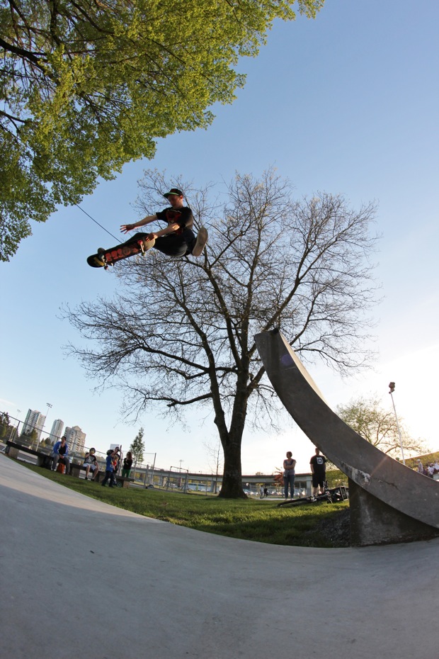 I don’t have too much to say about this Poco contest except it was really well done. Giver, or as he likes to be called – Michael James – put it all together with the City of Port Coquitlam and did a great job organizing it and running it. All the kids had fun, they all felt good even if they didn’t win, and there were no negative vibes. Rippers of the day were Lukasz Brodowicz, Parker Sherwin, Aiden Eastman and little Presley from Squamish who all destroyed it in the 9 & unders; Kyler, Jonathen and Mathew McCauley took the prizes in 10-13’s and the 14-18 category was untouchable. Fighter was killin’ it for Protest on his last day as an 18 year old, but also almost killed himself a couple times slamming straight to his side on flat from the top of the big handrail, but he still Benihana’d the 9 stair and the Double Set, Gap to Front Tail up the step up rail, and crooked the nasty rail down the big bank. But he didn’t place Top 3.