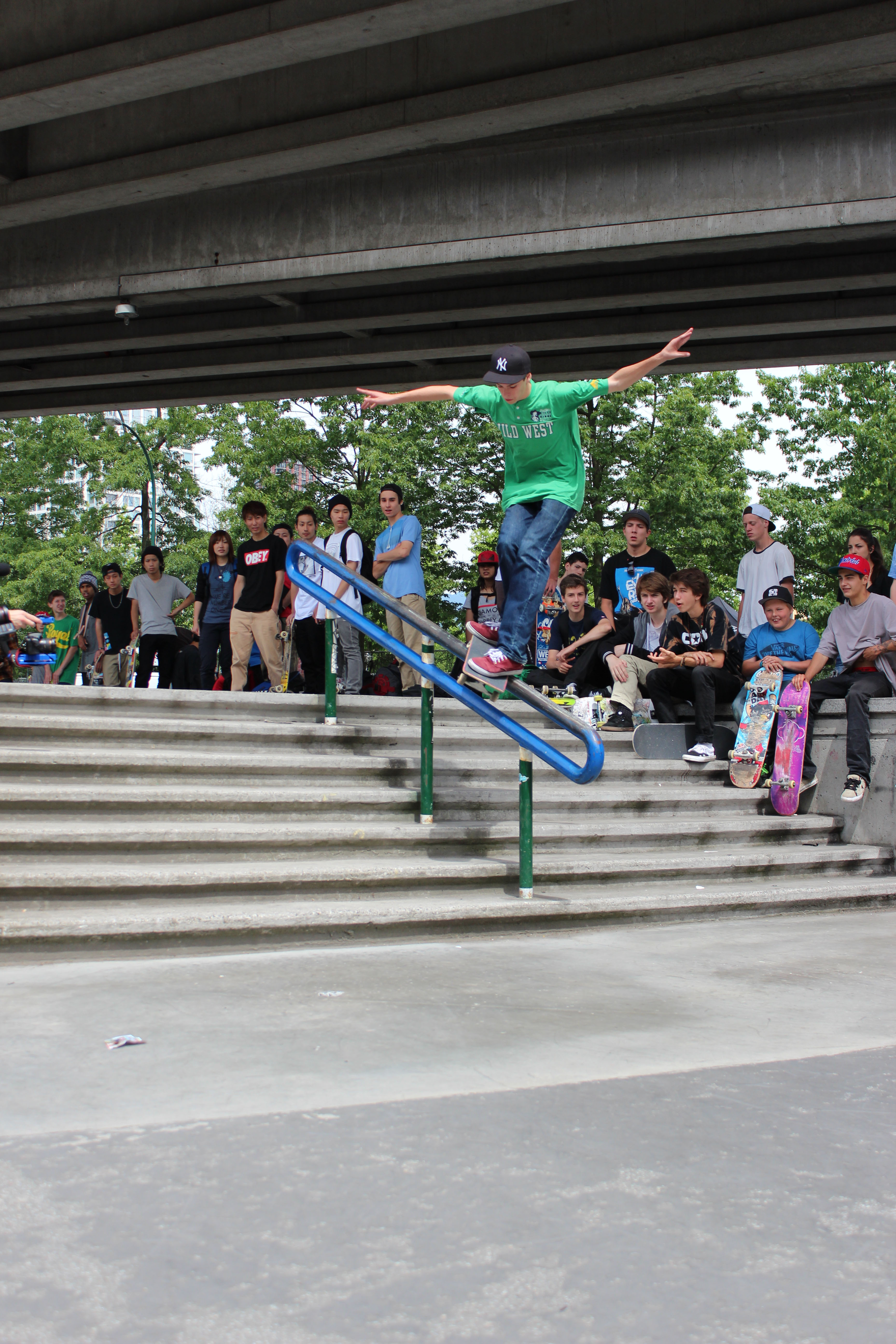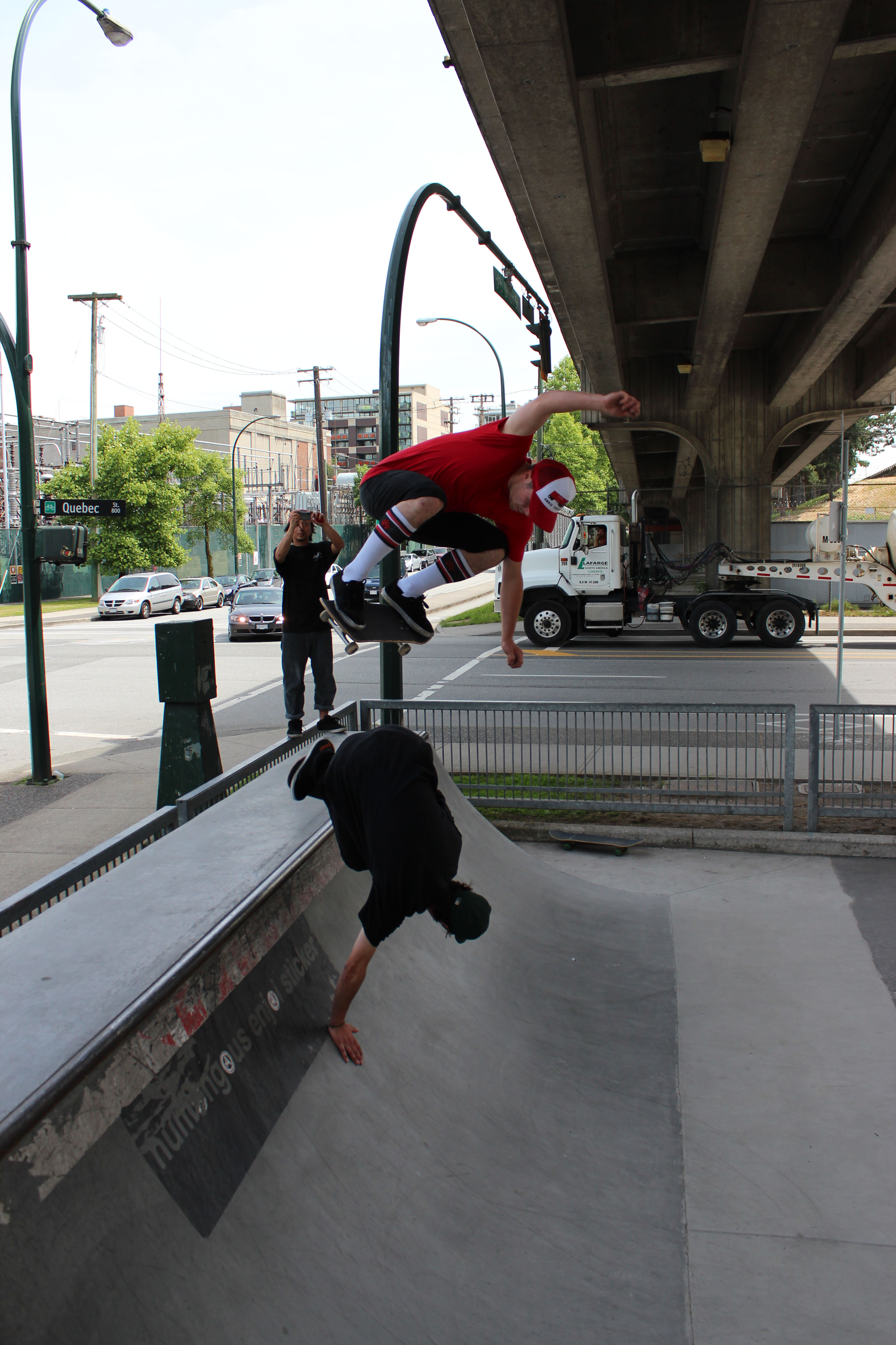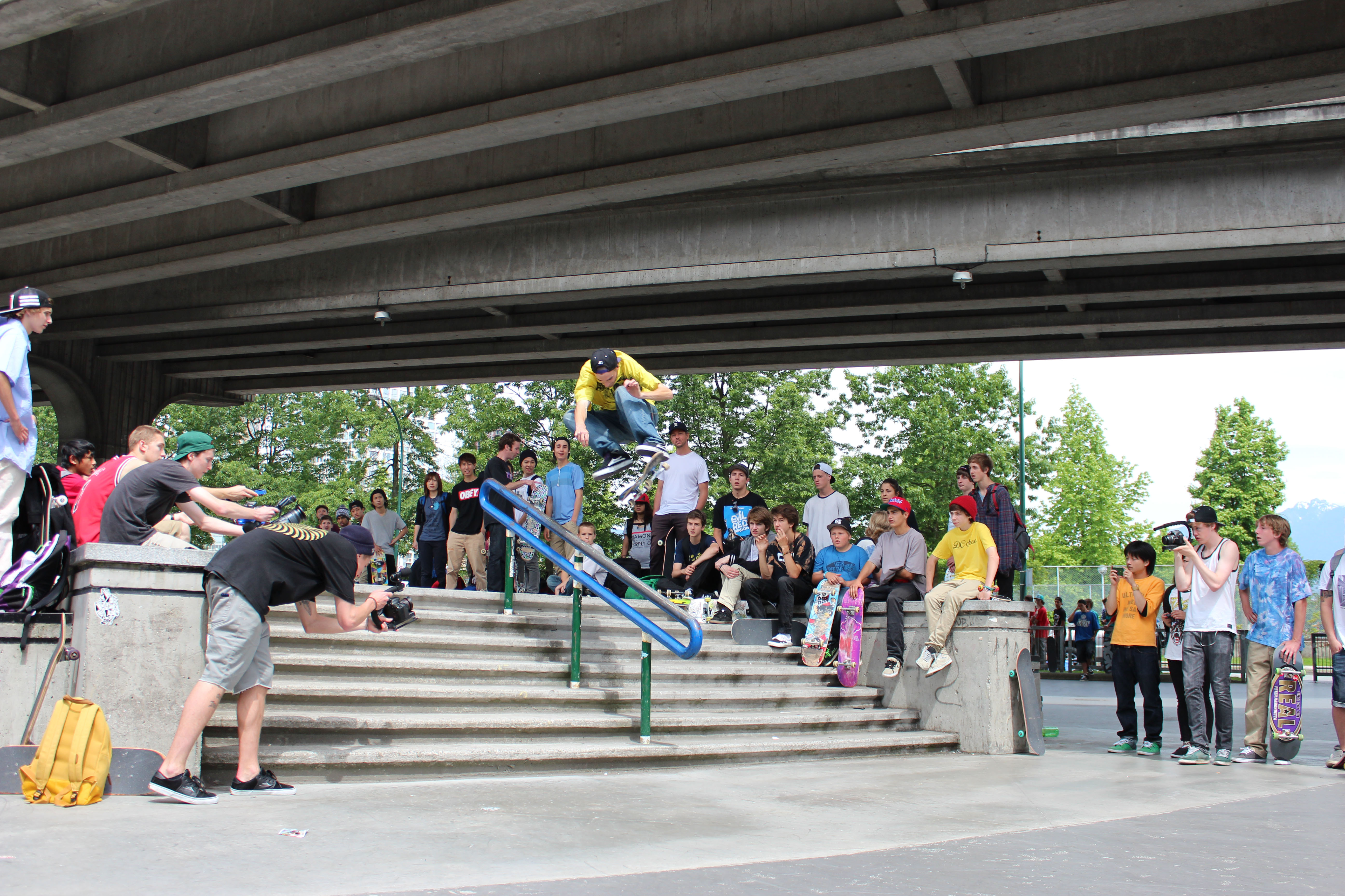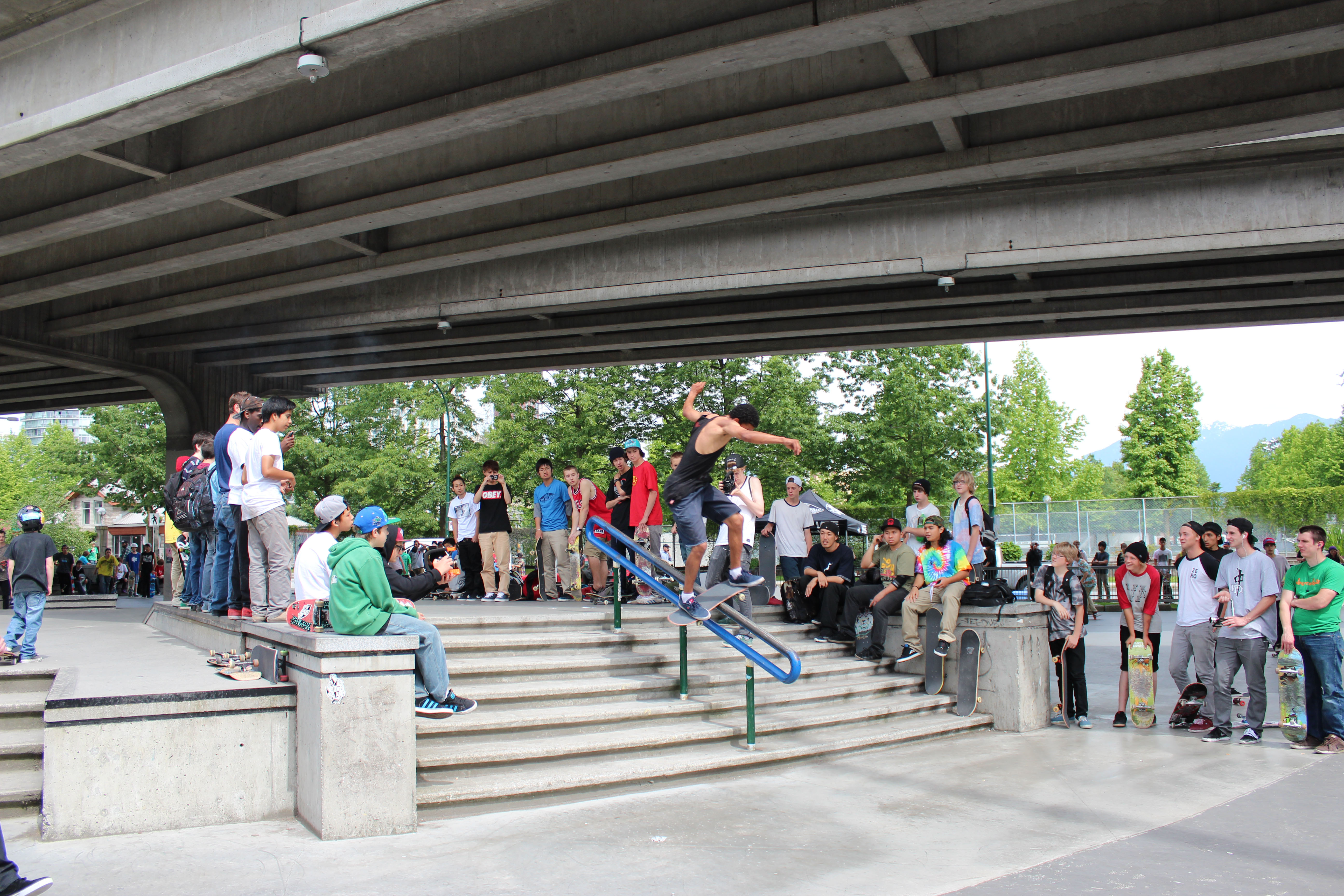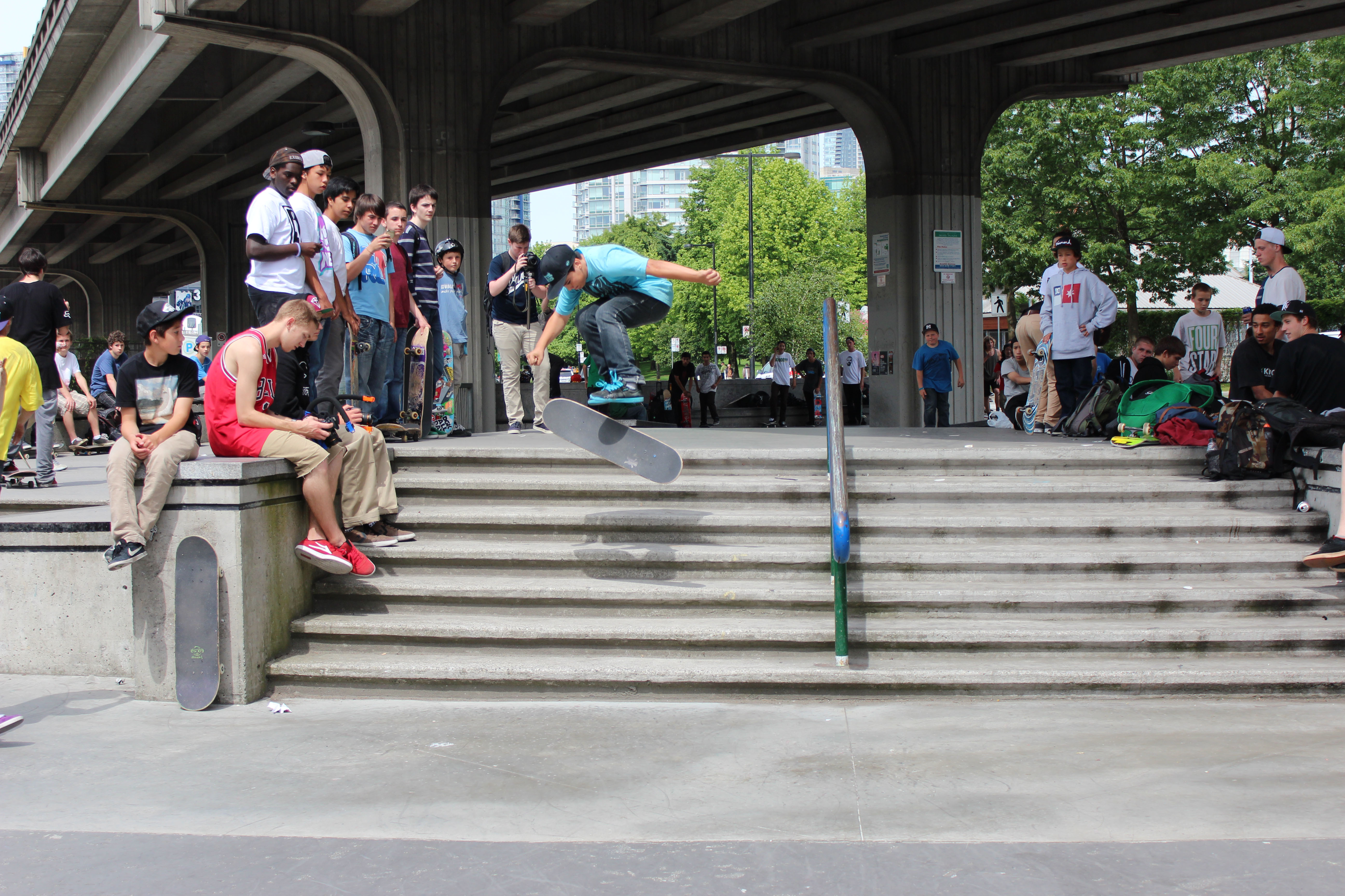 The mob moved out around 1:30pm to Cambie Bridge, followed by a couple street spots and then made their traffic disrupting way over the Georgia Viaduct towards Strathcona Park. I think there were more people at Strathcona at that one moment than there normally would be in an entire year. The place got destroyed, in a good way. I left early to head to Hastings Park for a BBQ, but not until after Ryan Prasad laid down a Heelflip Nose Manual Nollie Bigspin on the long ledge – solid buddy!!