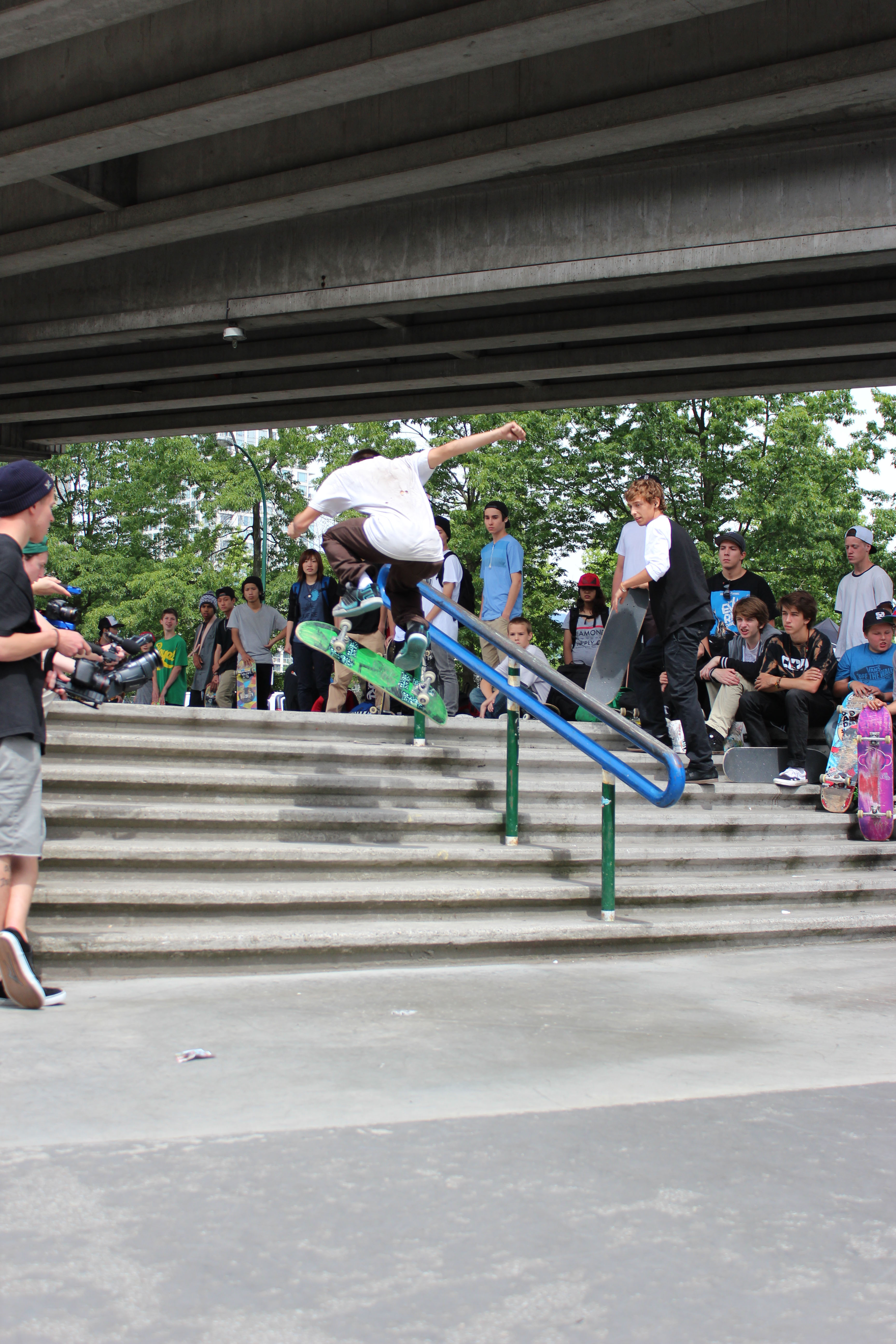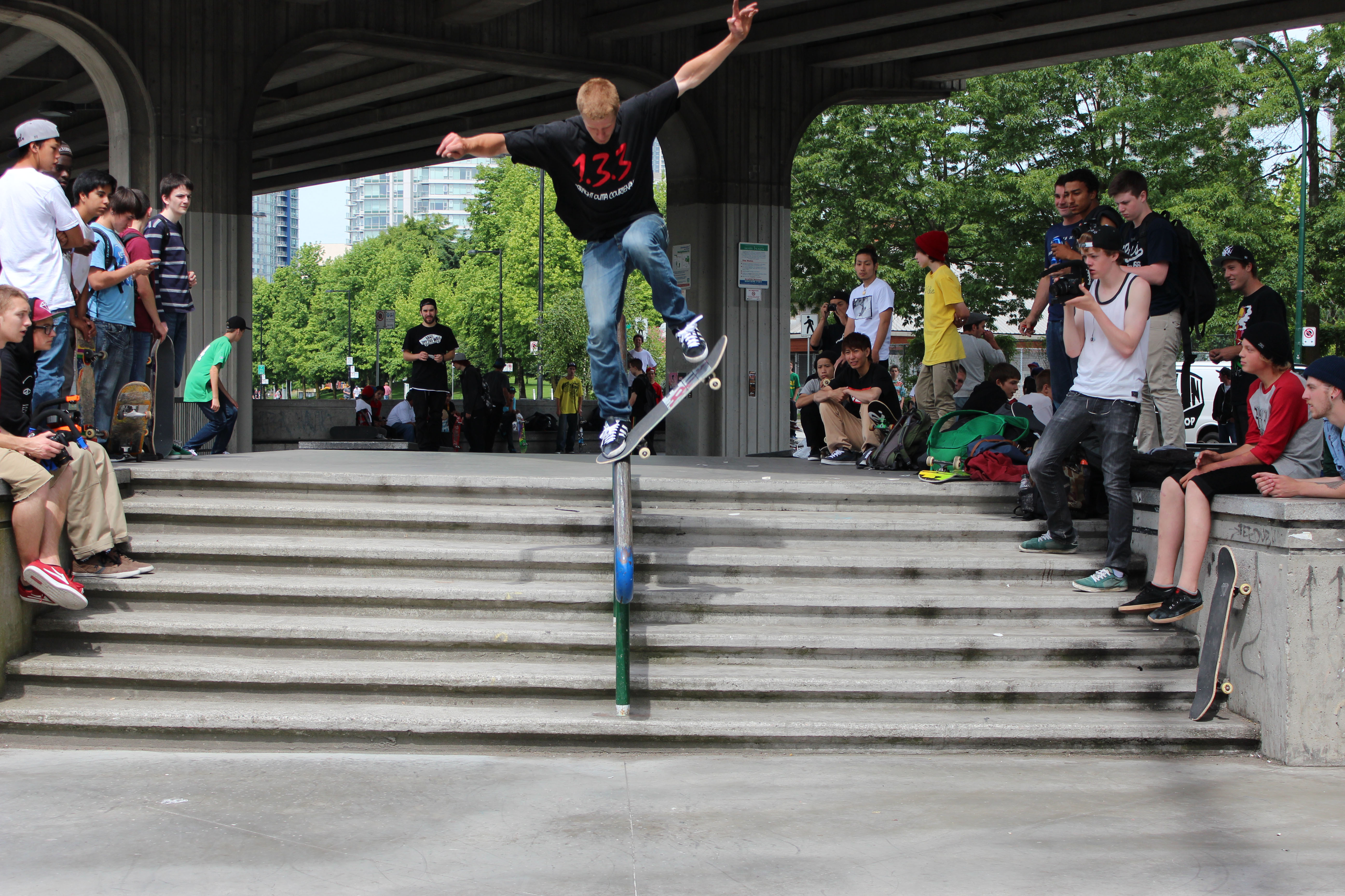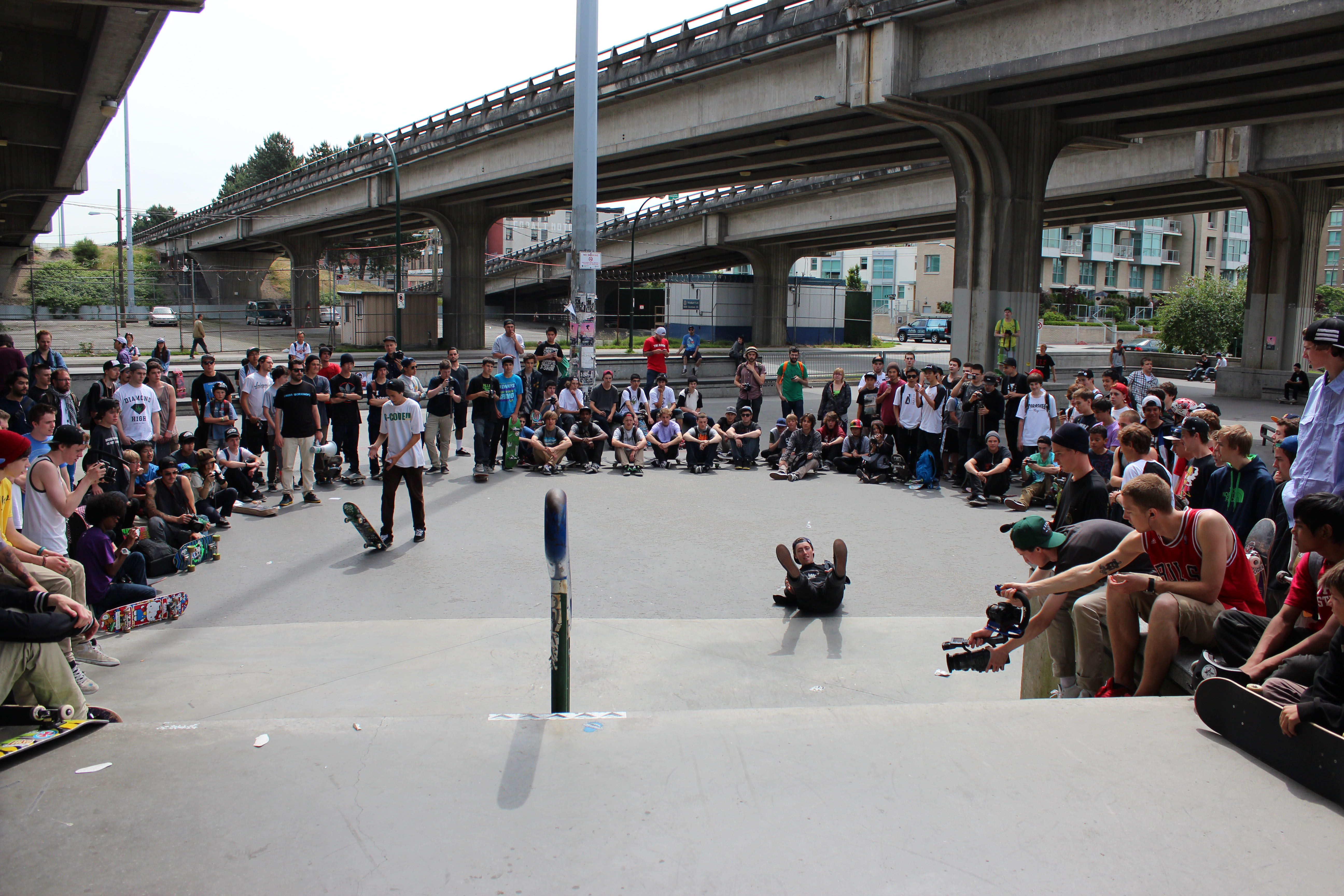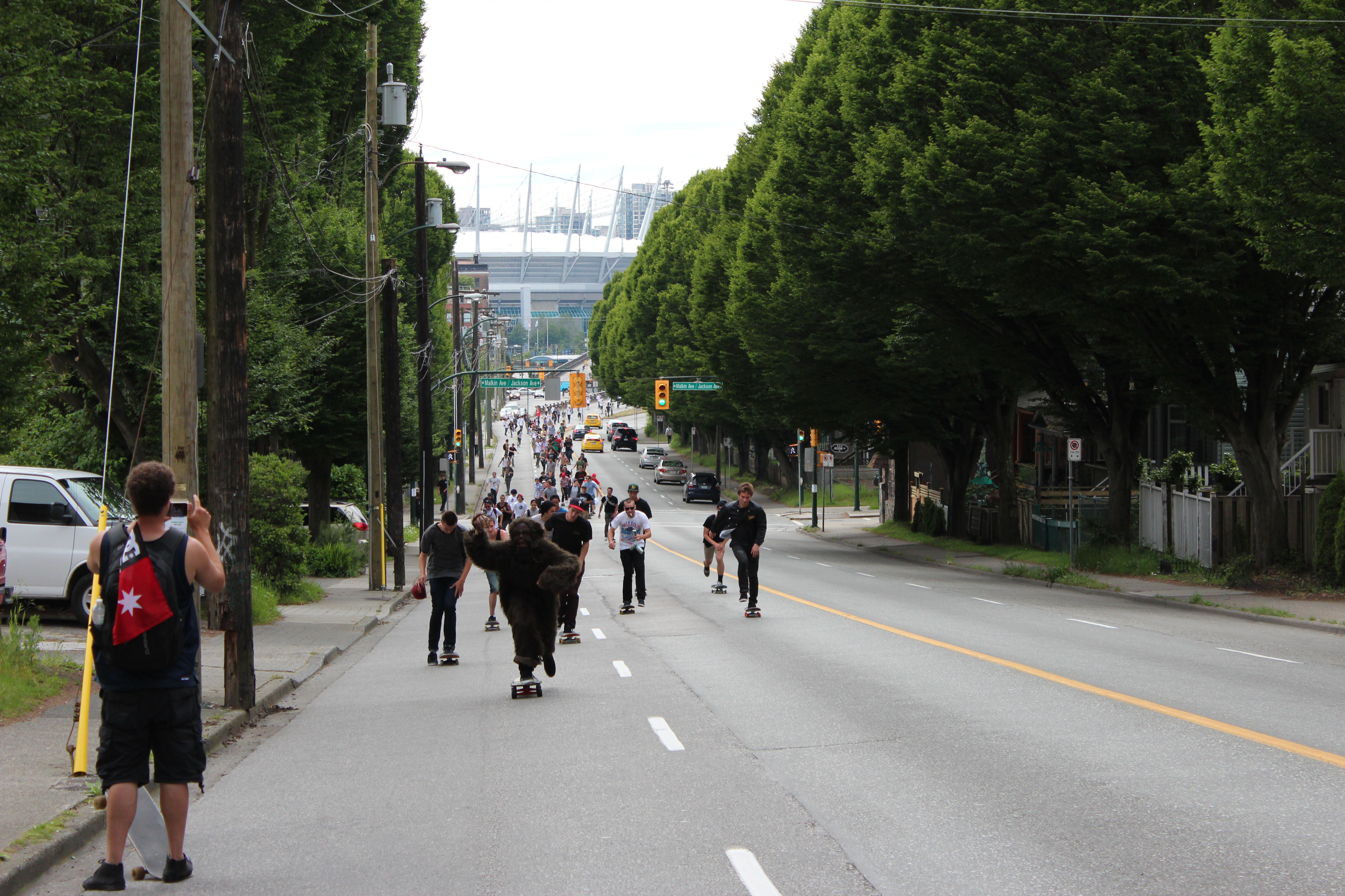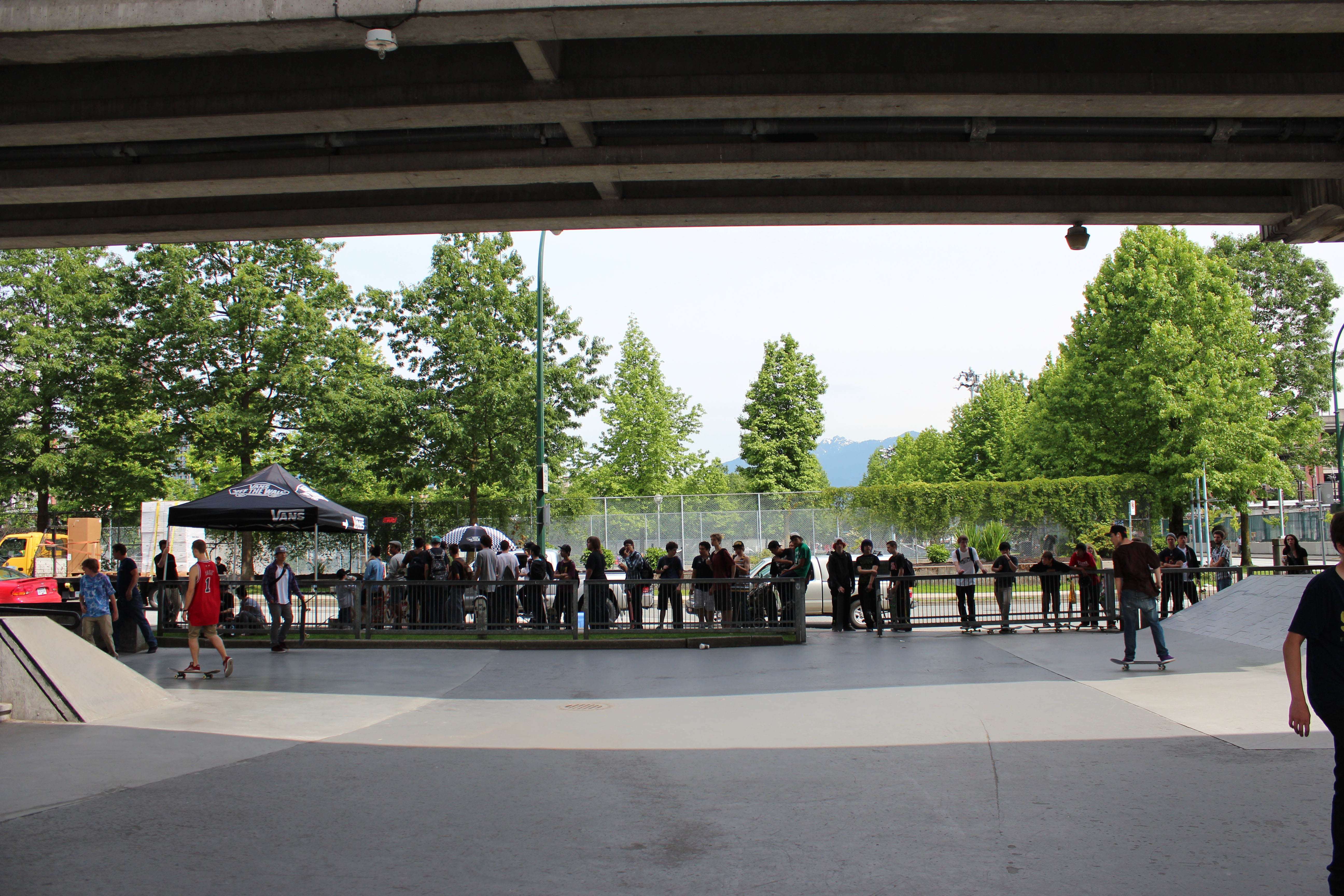 The mob moved out around 1:30pm to Cambie Bridge, followed by a couple street spots and then made their traffic disrupting way over the Georgia Viaduct towards Strathcona Park. I think there were more people at Strathcona at that one moment than there normally would be in an entire year. The place got destroyed, in a good way. I left early to head to Hastings Park for a BBQ, but not until after Ryan Prasad laid down a Heelflip Nose Manual Nollie Bigspin on the long ledge – solid buddy!!