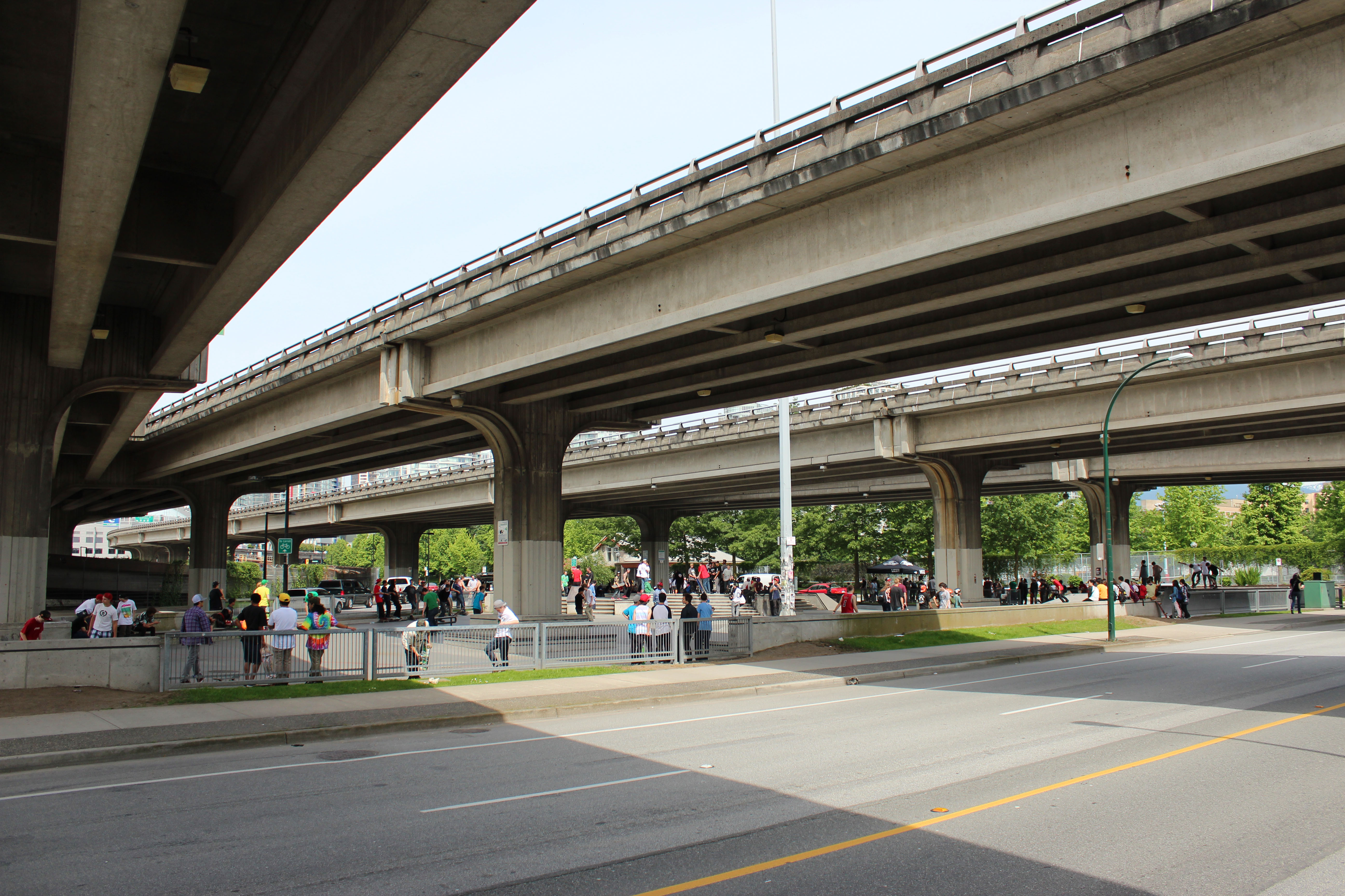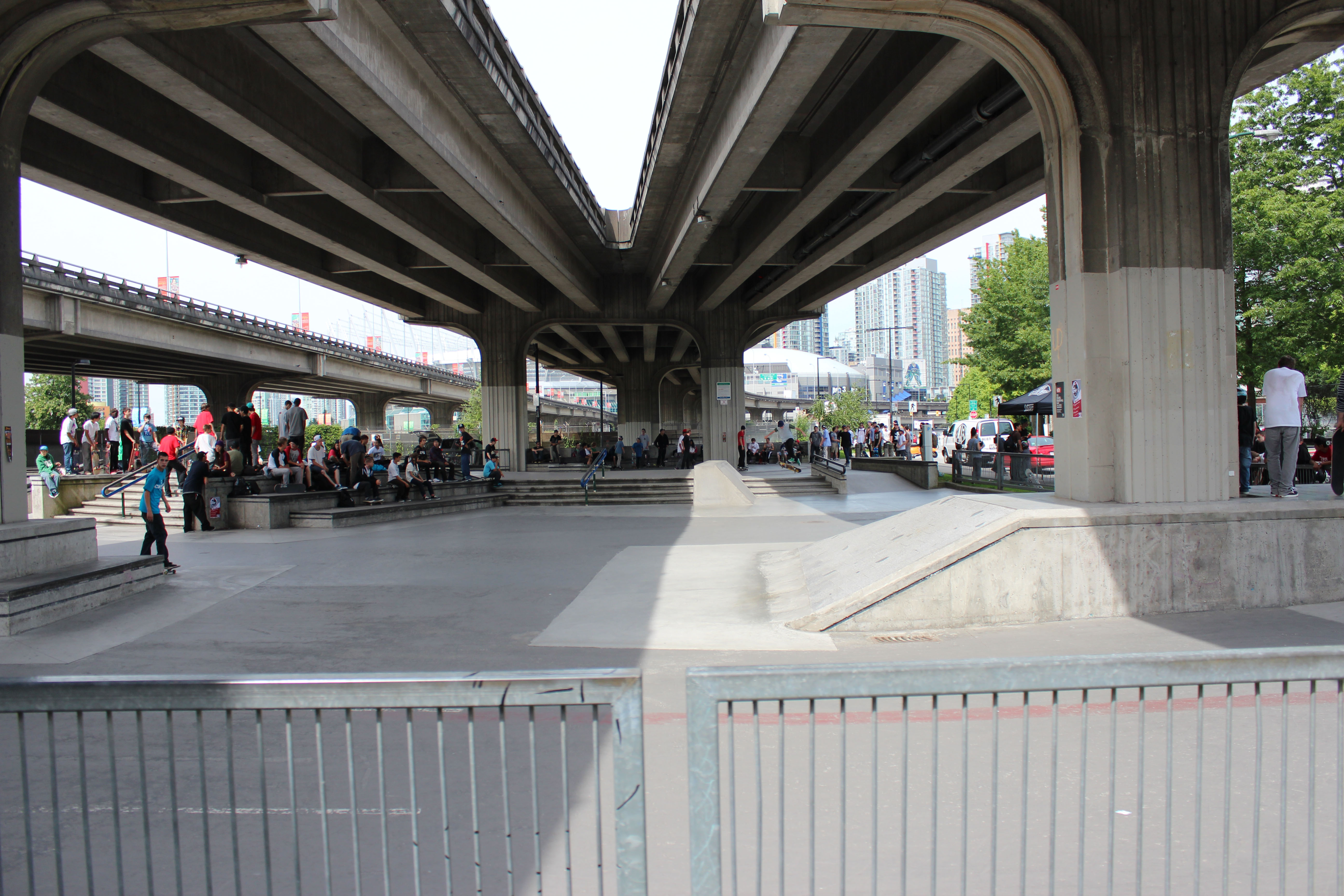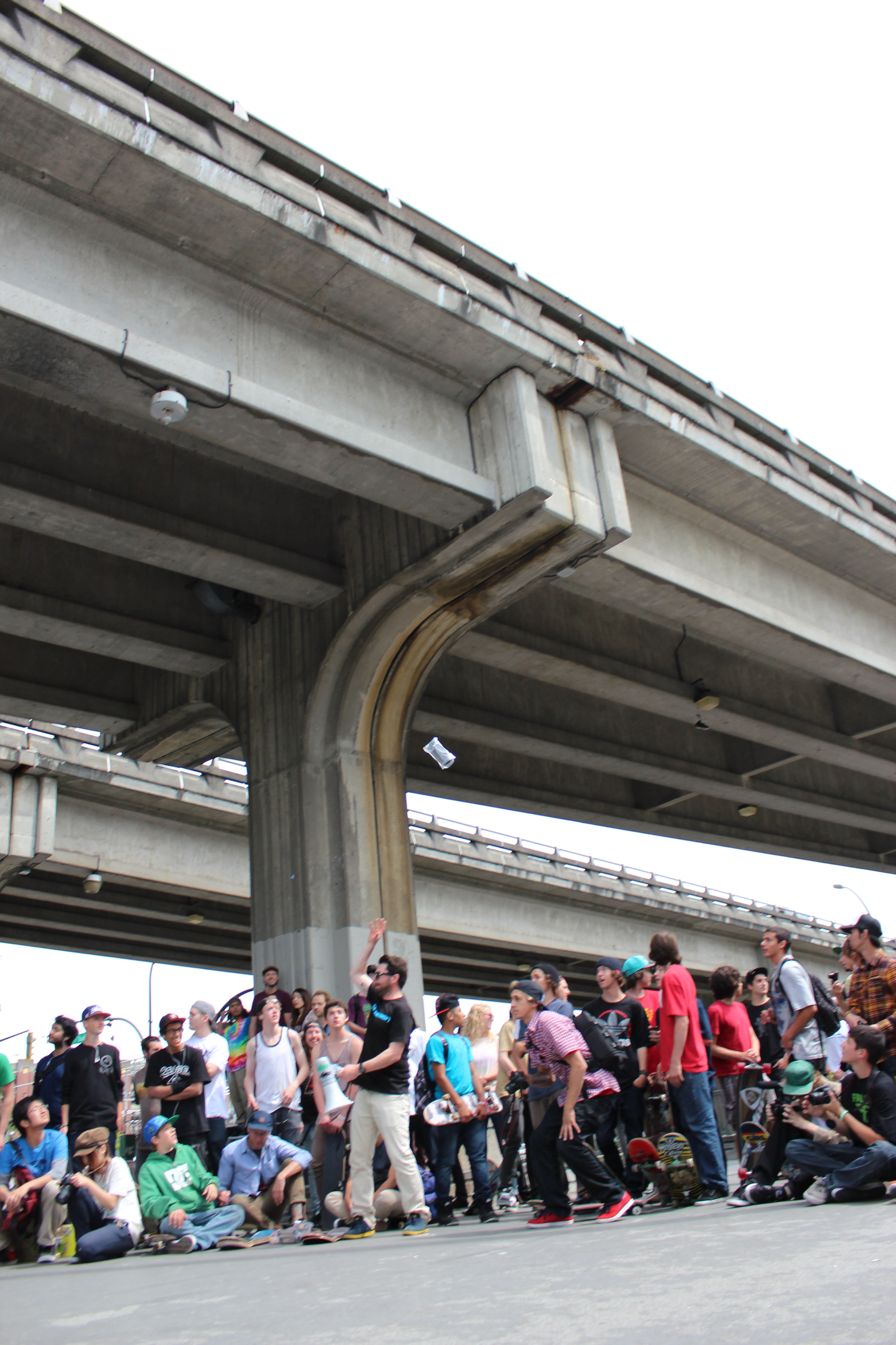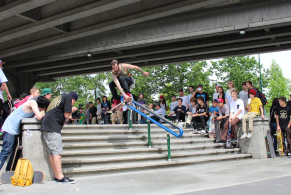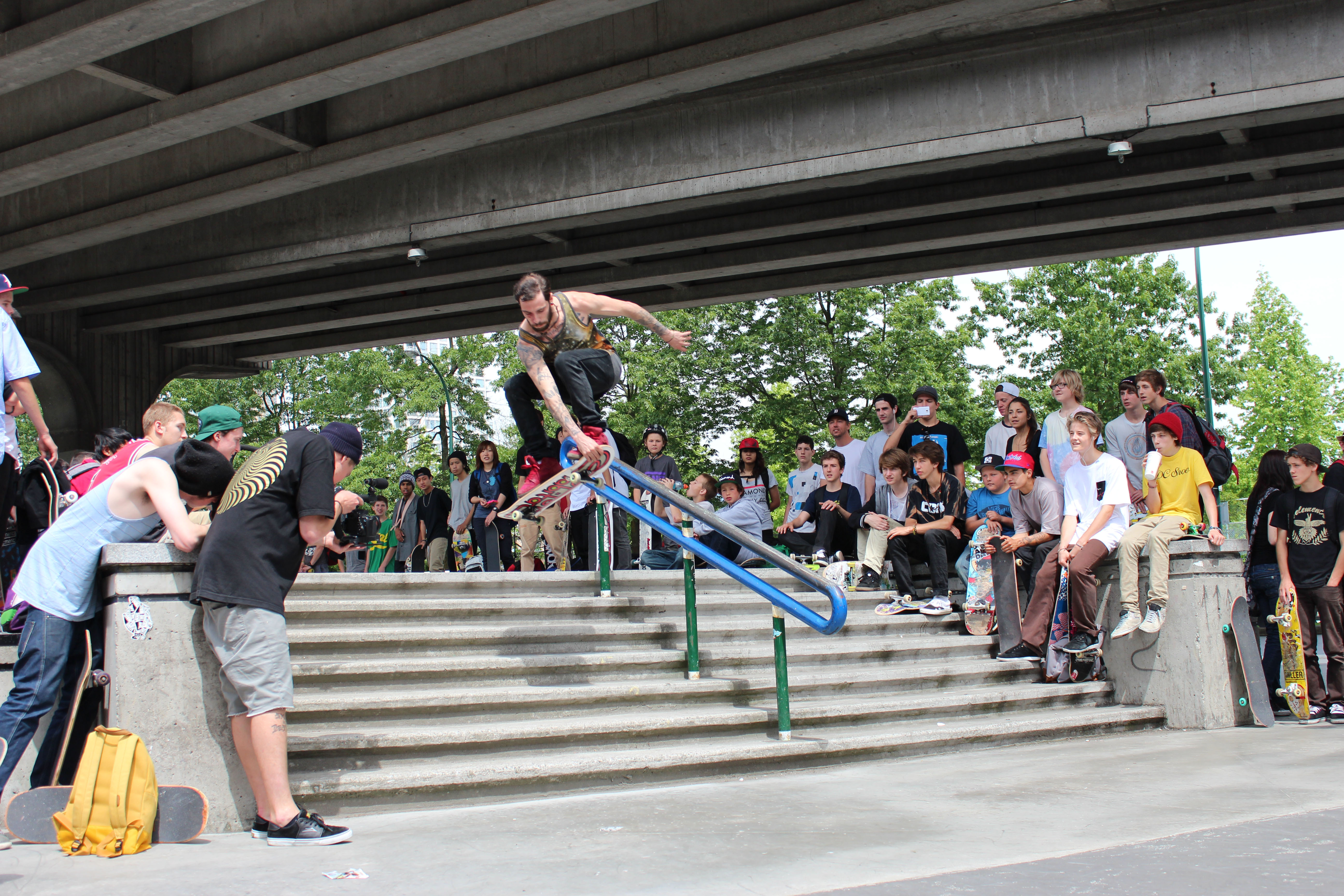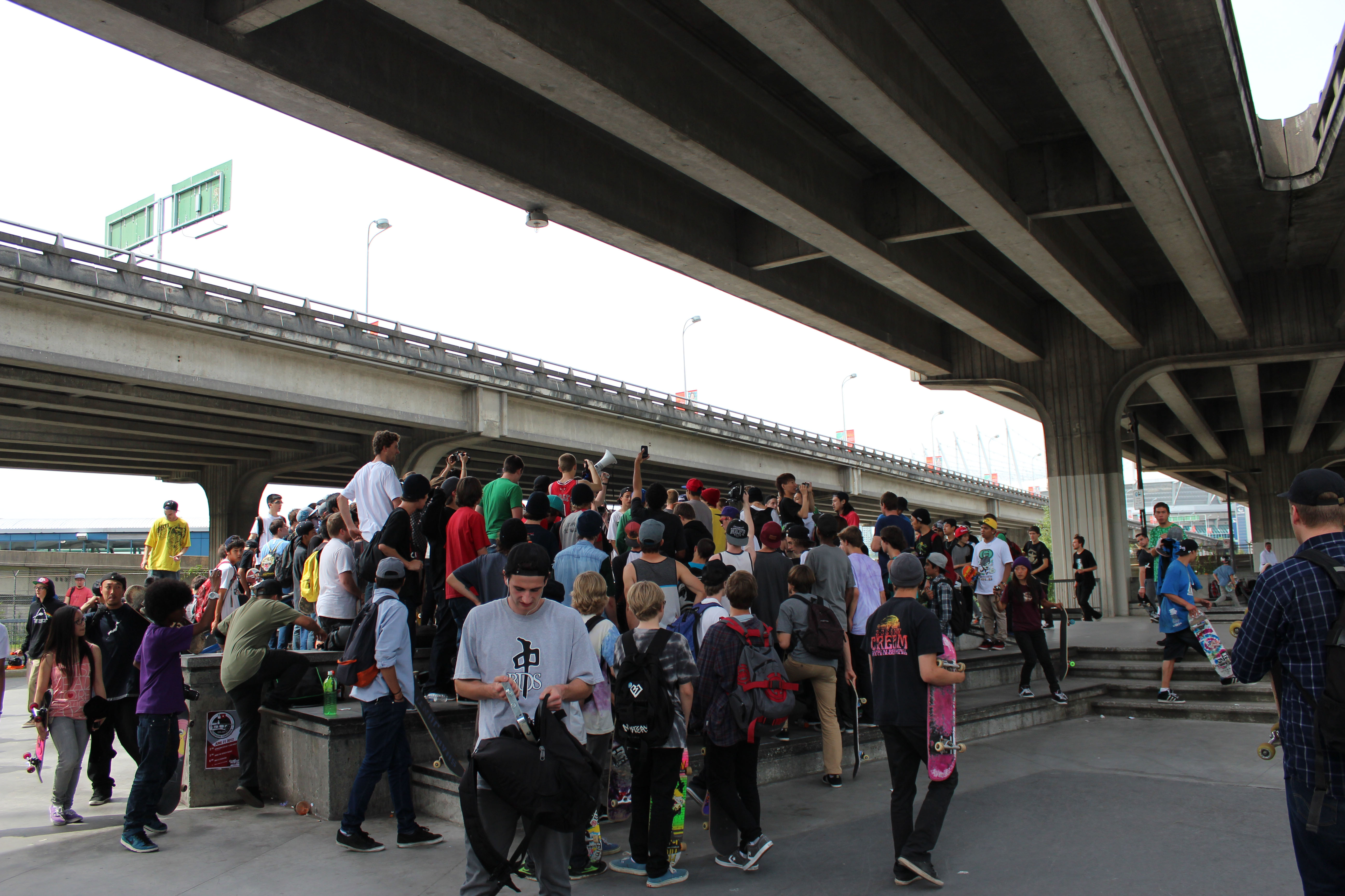 The mob moved out around 1:30pm to Cambie Bridge, followed by a couple street spots and then made their traffic disrupting way over the Georgia Viaduct towards Strathcona Park. I think there were more people at Strathcona at that one moment than there normally would be in an entire year. The place got destroyed, in a good way. I left early to head to Hastings Park for a BBQ, but not until after Ryan Prasad laid down a Heelflip Nose Manual Nollie Bigspin on the long ledge – solid buddy!!