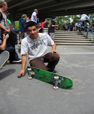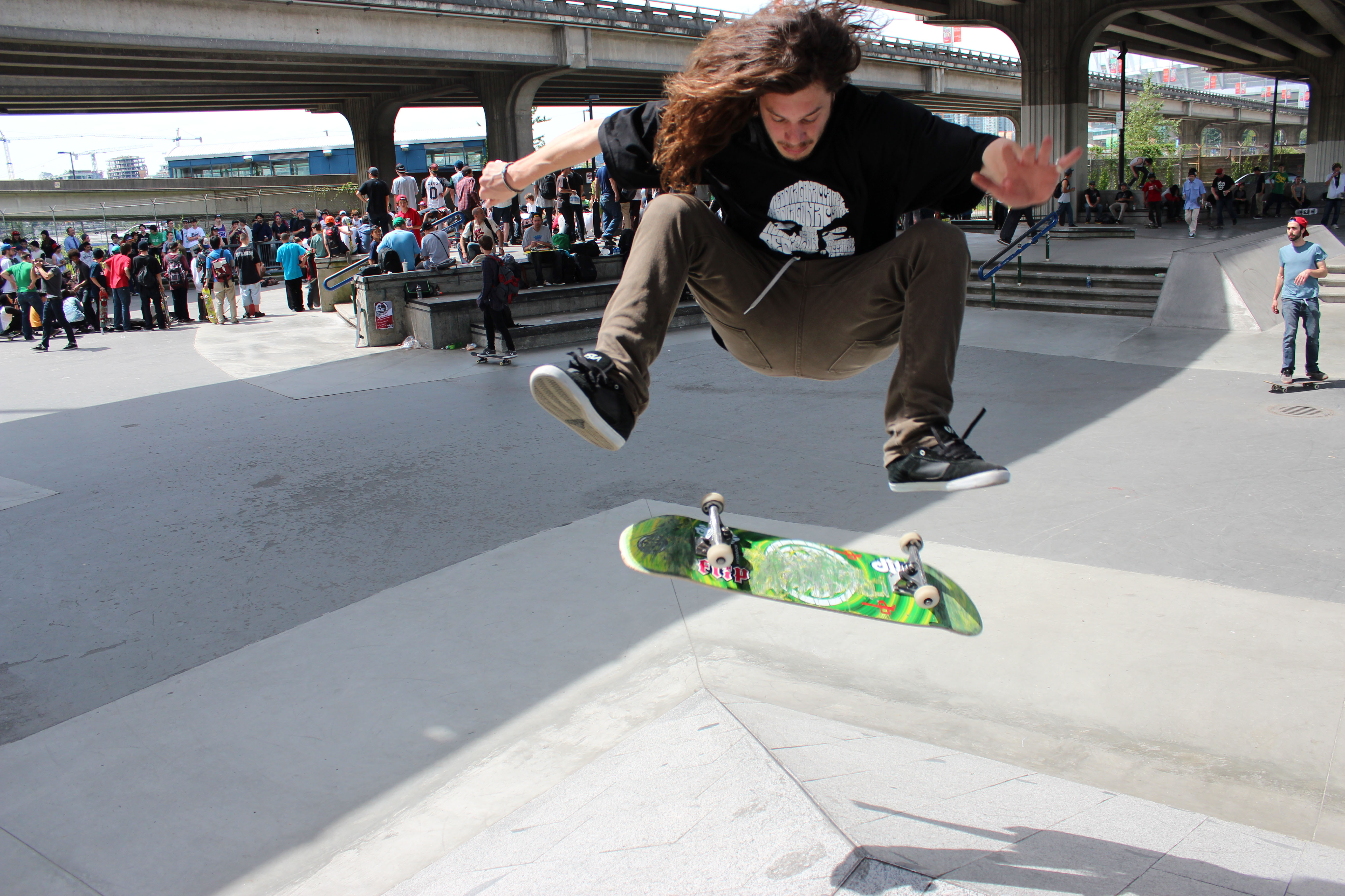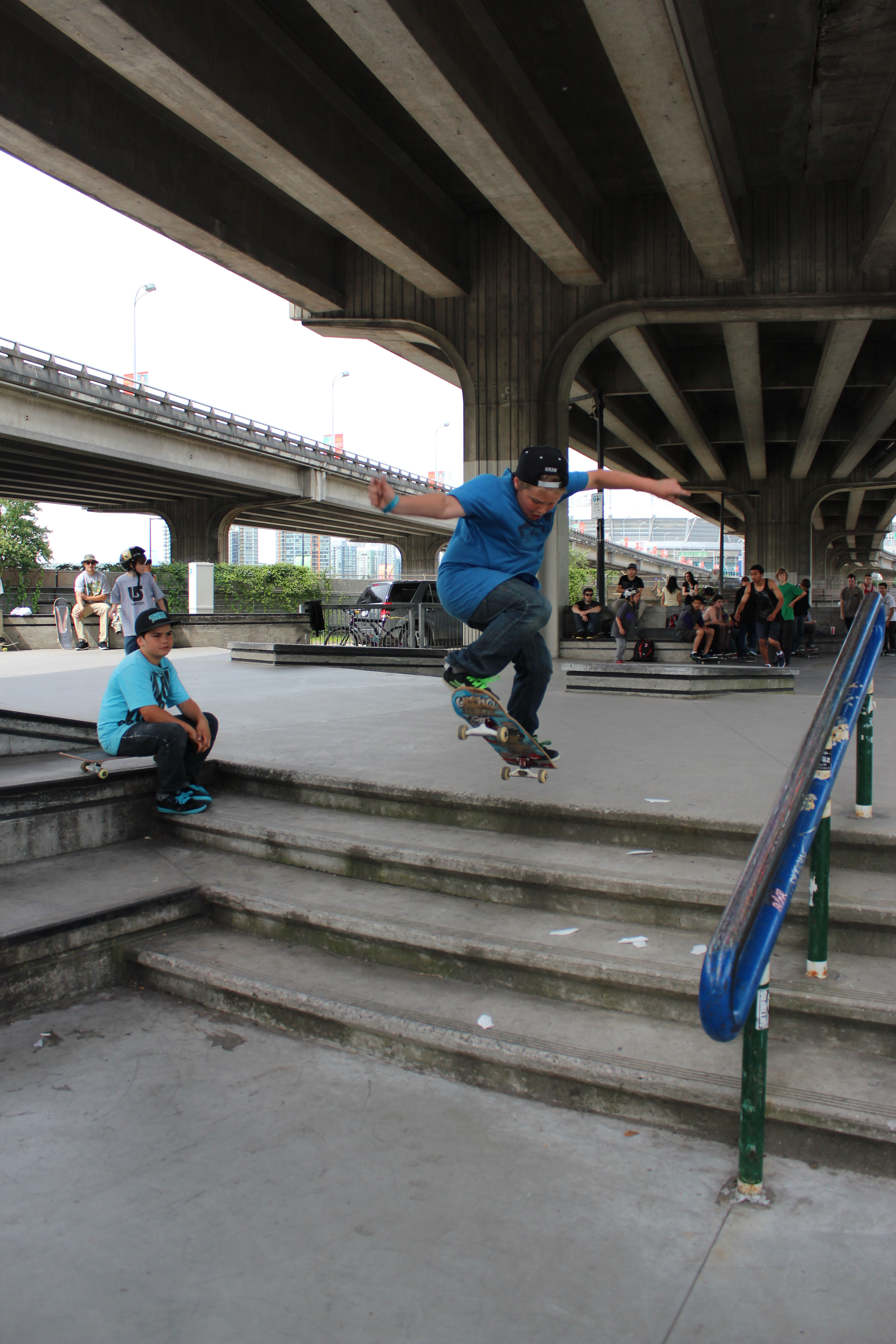 I got down to the Skate Plaza at about 10am to be greeted by hundreds of people of all ages skating their hearts out already. There was a huge line up for “Waffles on a Stick” formed on the side road and the crew was in full effect. Hosted by Vans and Underworld, along with DC, RDS and many others, MC Cyrus was ready to take control of the mob any time he felt like it. I skated around a bit and threw down some tricks on the Wally Ledges around the pillar and then started shooting photos. The best trick contest down the 7 stair was tight. Cody (GhettoBird) from Bonsor hardflipped over the rail, Ryan Prasad and Graham Bohn threw down multiple flip tricks to perfection, Dominic Devries showed up with a backside flip, and then kickflip front boarded the rail – the list went on and on. Cyrus was just handing out boards like Trick or Treat on Halloween. The kids skated the stairs, the hubba, the ledge over the grate, and the hip, and all 4 got demoed…