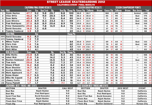 Nyjah Huston has proven time and time again that he is the man when it comes to Street League. He won 3 out of 4 last year, and is now already 2 for 2 in 2012. It still blows me away when I watch the Street League series because almost every trick that goes down is what used to be a closing banger for a video part. These guys are tossing insanity first try, every try. Tricks that should take a week to land once, just getting pulled out of people’s back pockets and displayed perfectly for the world to see.