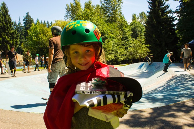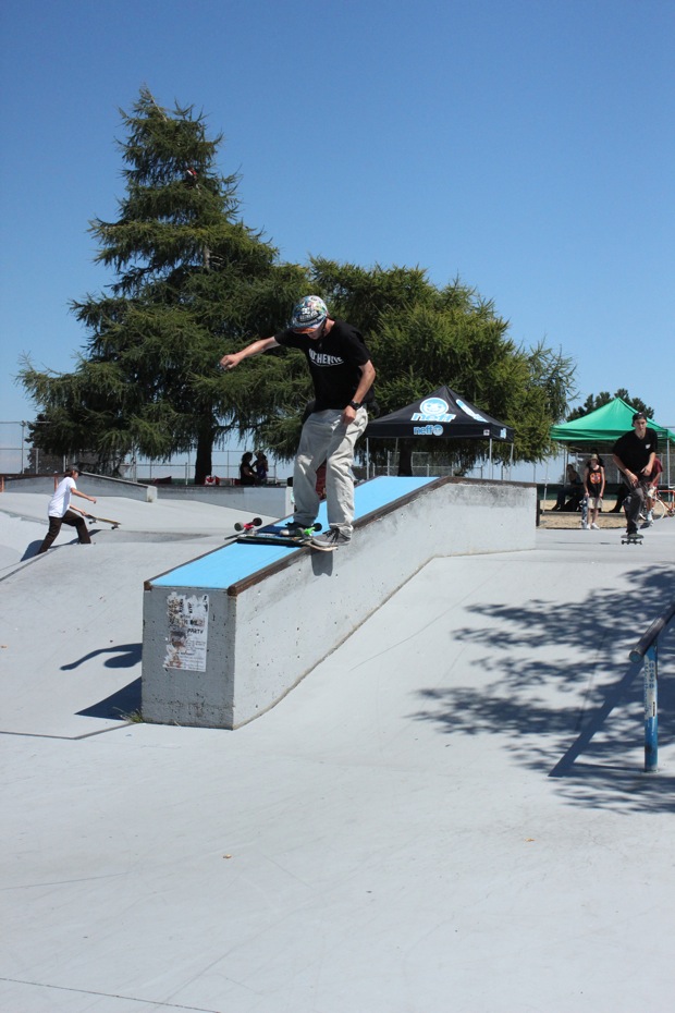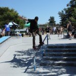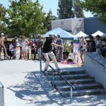What a perfect day for a contest, the sun was blazing, the weather was hot and tons of kids were ready to put their lives on the line for prizes and plaques. Railside Skate Park in Poco has always been a big contest/demo park but it was the first time Hippie Mike had run an event there, and the response was solid. With about 80 people competing and around 150 in total at the park everyone knew that this contest was gonna be awesome to watch and right from the start it totally was. The Mini’s went out there full force and tore up the place, little 4 year old Kaelen Faux ollied out of every bank there, Austin MacBeth and Django Caseley shredded the big bowl, Trent Johnson showed off his handstand freestyle skills and little Lola Palver body varialled around the whole park. But none of them could beat The A-Man Aidan Eastman. This kid has been coming to Hippie Mike comps for 3 or 4 years and is still a Mini (10yrs old or younger) and when he stepped up and ollied the 9 stair the whole crowd knew who won that category… BOOM!