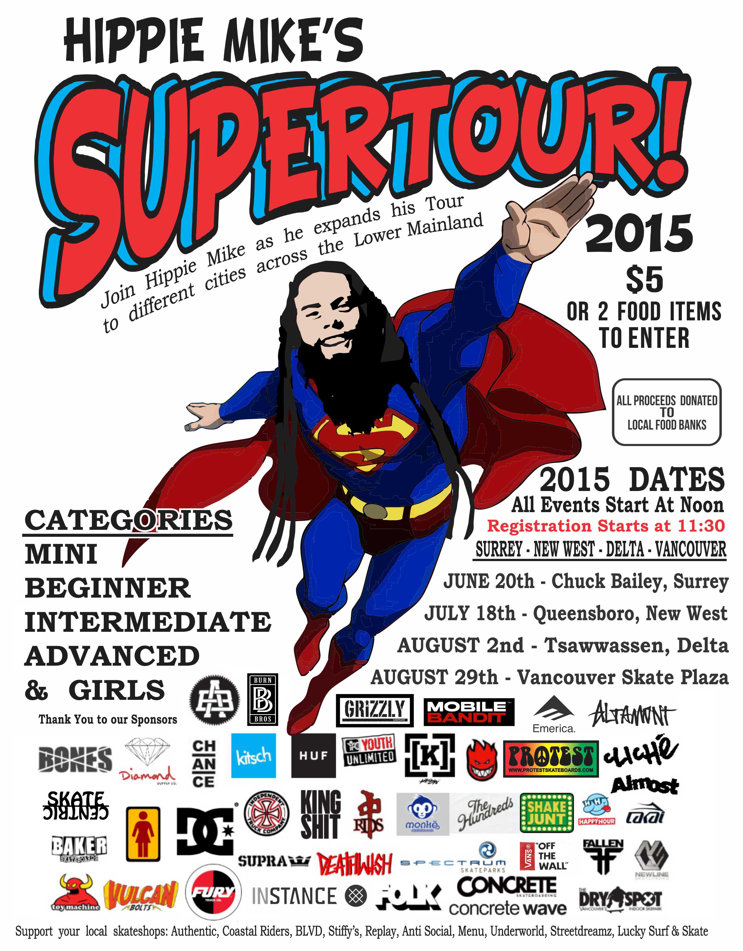 Hippie Mike’s Super Tour is back for the second year and the dates are set along with the 4 locations being locked down. This year is going to be amazing as Mike is preparing to hold contests at 4 of the best made skate parks in the Lower Mainland / Fraser Valley.