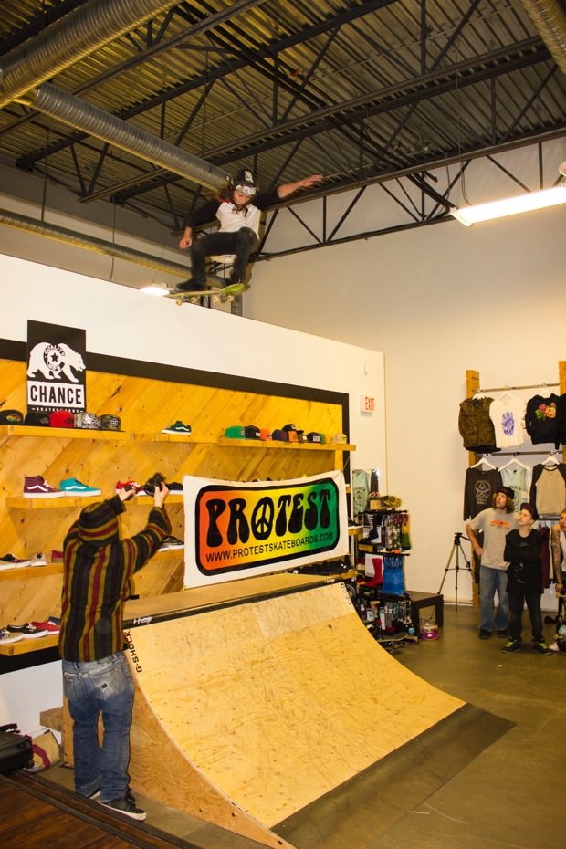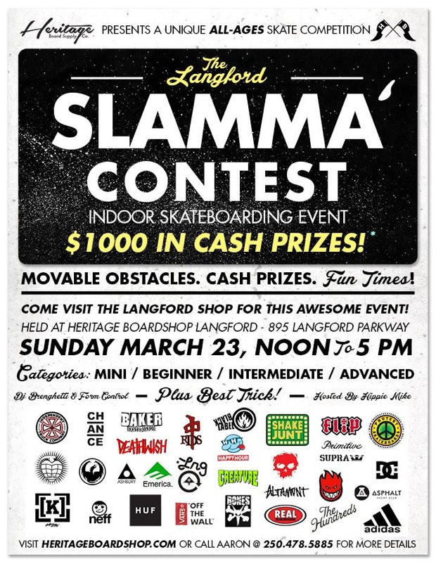 It was one of the nicest days outside so far this year but it was time to enjoy the day inside of a big ol’ skate shop in Langford, BC called Heritage Board Shop on the Langford Parkway. This contest came together fast and had full support from every skateboard distributor out there instantaneously. How often does anyone run a skateboard contest inside of a skate shop?
