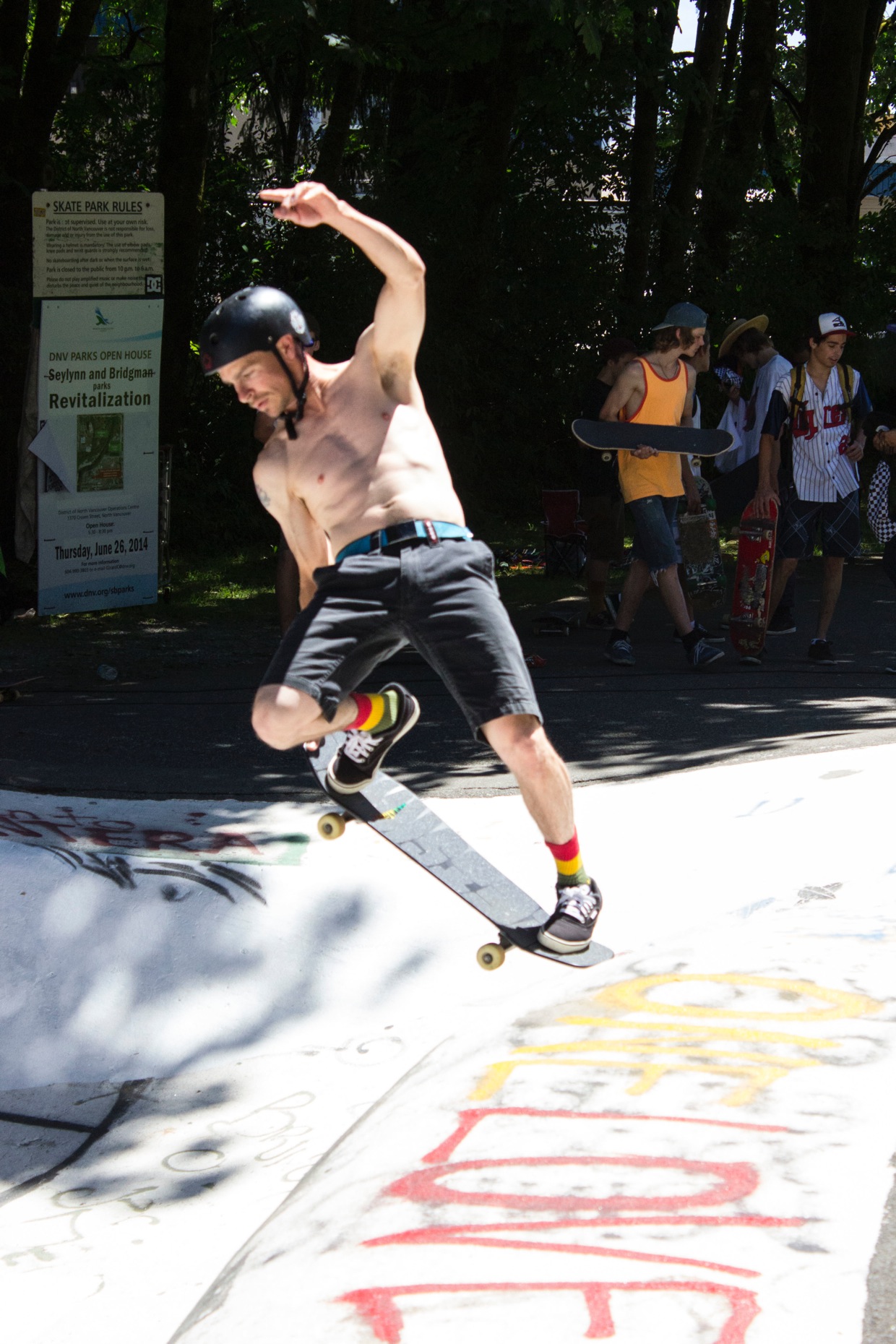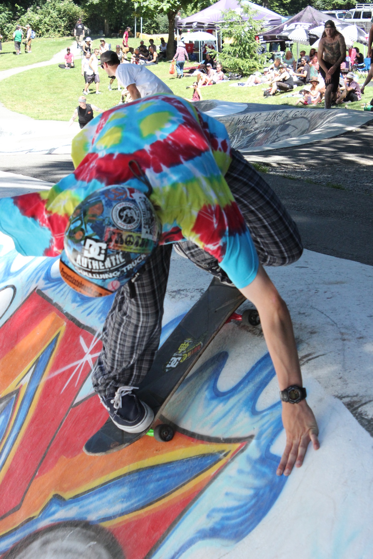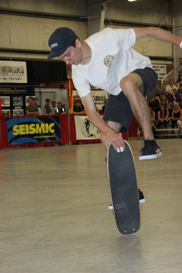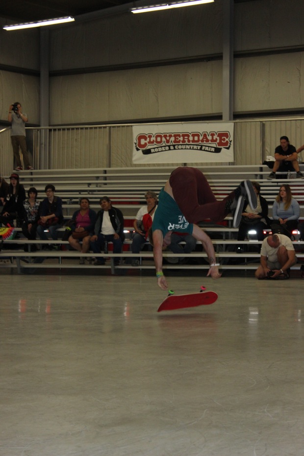 So before Advanced we put on a Best Trick Contest on the Quarter Pipes which was for a $100 gift card to 4More Tattoos. Sooke/Langford shredder Merrick Orr climbed up on top of the shoe wall and tried to Tail Drop into the quarter. It was about an 8 foot drop to the transition and the first try hurt him bad. The maniac he is, Merrick kept climbing back up and crashing again and again but staying on his board every attempt.