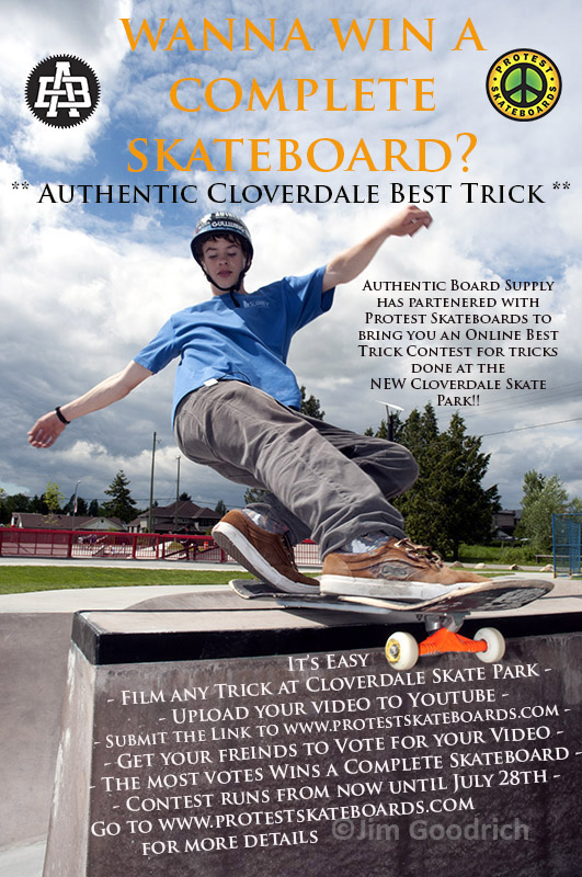 Film an “Authentic” or Awesome trick at the park, upload it to youtube and then submit the link to the contest on the protest site – www.protestskateboards.com (Please name your video CLOVERDALE BEST TRICK – YOUR NAME to make it easier for people to search for your entry and get you more votes)