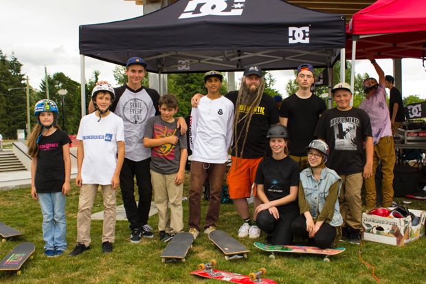 The start of a new era began exactly how the last one ended, it was a great day in Cloverdale and the New Cloverdale Skate Park was jumpin’ with a crew of awesome dudes of all ages. Hippie Mike on the mic, DJ Cuz-O on the mixing tables, and the DC Rep Kristen hangin’ out all day helping out with registration and hooking kids up with gear left right and centre. We kicked it off with the Mini Category and all 5 kids were going hardcore, little Aidan Eastman went down hard on his wrist down the 5 stair rail and had to rush out for X-rays, but he was okay in the end. Emmanuel killed it hard in the division utilizing all obstacles and even ollied the big 7 stair, lil’ Kaelen Faux shredded like no 4 year old should know how to and came in 2nd place, followed closely by Carson Ziegler. The Beginners came out just as hard, except there was 20 of them. It’s always a big eye-opener when everyone in the park has astonished looks on their faces while watching beginners, you know right then that the contest is gonna get hectic. Masson Solski squeezed his way into the finals and then turned it up about 4 knotches to take home 1st Place. All the beginners skated really solid putting together runs and landing lots of tricks but the ones that stood out the most were Damon Morgan, Devin Petry, Layne Nyirfa, Yoshe Durston and Kyle Neill. All 6 of these guys killed it in the finals.