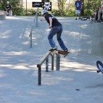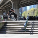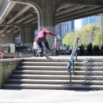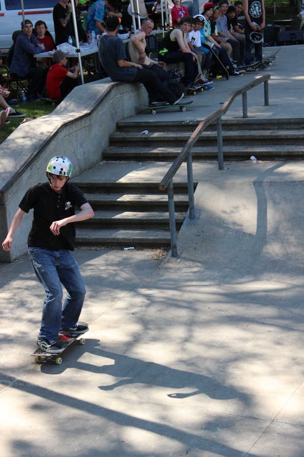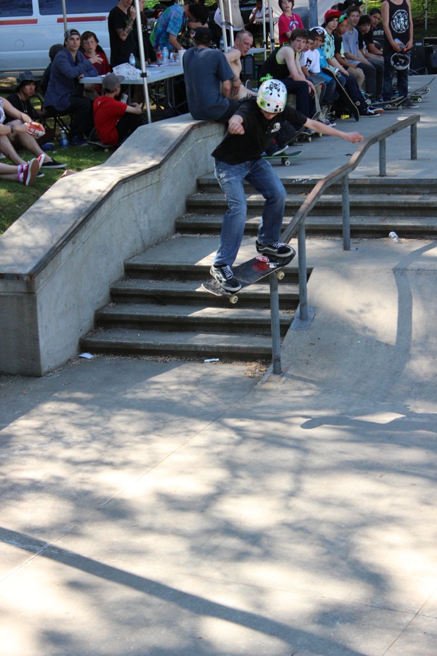 Then came Advanced, wow… 15 dudes, all shredders, and every one of them laid it down in their qualifier runs. Mathew McCauley got bumped to Advanced for getting his first sponsor with Protest Wheels and he did pretty good against the big guys. Started his first run by kickflipping the 9 stair, threw some solid rail tricks and even dropped a perfect frontside shovit on that 9. Fighter, Jordan Strong, Ryan Barron, Peter Nicholson, Jay Mykyte, Cisco Gooding all killed it but did not make finals. When it came time to decide the Top 5, 3 of them were obvious – Tony Casano, Weston Ganger and Dominic Devries, who had 2 insanely flawless runs. The others that squeezed their way in there were Calvin Dignard and Jordan Repin. I hadn’t seen Repin at one of my events in a while so I was stoked he made finals because I know how he skates under pressure. Tony had 2 amazing qualifier runs and then just couldn’t pull it together in the finals. It happens man, and he still killed it, but you read the list of who made it, and really, if you miss a trick you’re screwed, just like Street League. The top 4 were all really close but Weston got knocked down to 4th place. Weston Ganger is a maniac with so much skill I can’t believe this guy doesn’t have any sponsors, he grinded the 9 stair rail and then ollies right up the 4 stair to set up for a grind down the hubba on the other side of the park, nosegrinded the hubba down the double set, smith grinded the flatbar into the steep bank and even dropped an airwalk to hardflip up the step up. Somebody hook this guy up! 3rd place was Calvin who can lay it down at any time anywhere street style. Calvin’s got so many ledge and rail tricks on lock and can hit the big gaps at any moment. He finished it off with a sick feeble grind bigspin on the bump to rail. So it came down to Jordan Repin and The Dominator, both had super perfect runs in the finals but Repin went a little more tech than Dominic and even though  he gave the judges a backside 5-0 down the 9 stair rail to finish his run, for a change Dom got 2nd place. Jordan Repin did some solid tricks, front blunts and mean tailslides on the ledges, nollie boardlides and backside 360’s and just beautiful flow through the whole park. At the end of his run he stood their stunned not knowing what he was going to do for his last trick and then he just stepped onto his board slowly and busted out a perfect frontside bigspin boardslide on the bump to rail. Congratulations Jordan, that was not an easy win…