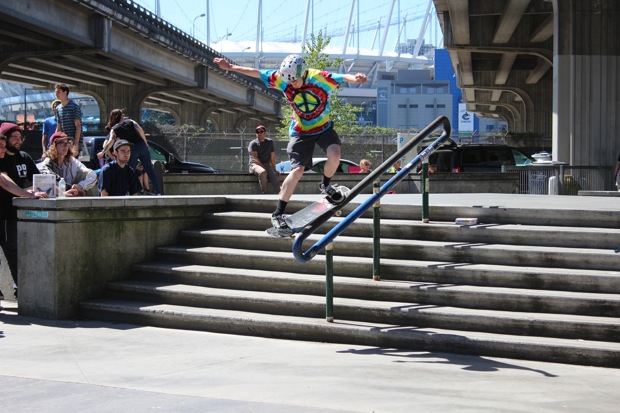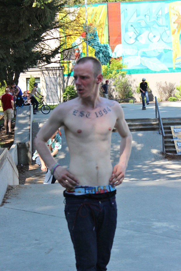 So today was one of the best Canada Day Seylynn Jams in a long time. The weather was amazing, the crowd was full and there was sick skating going on all day in every category. Ben Chibber brought out a group of kids that localize his indoor park – The Dry Spot – and they were shredding in Beginner. Presley was the only dude in the finals that wasn’t part of their crew, and the little 5 year old from Squamish let them know who`s boss, but still finished in 4th, out of 8 kids in total. The Intermediates were also laying it  all on the line with crazy tricks and awesome flow lines. I think the kids name that won it was Ross but I can`t remember, which is bad since I MC`d their runs. Either way they all skated good. The ladies were shredding the bowl, Protest Rider and my wife Carrie Williams finished in 2nd place behind crazy ol` Jess who hits the most difficult speedlines, and today did them all barefoot. Jess ended the ladies jam with a face smash in the deep end carving in frontside a little to fast. 5 girls in the comp, stellar.