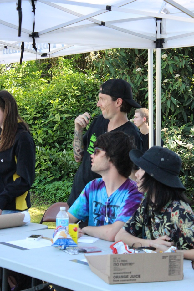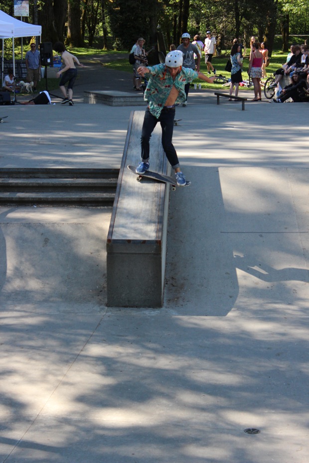 Another gorgeous sunny day in British Columbia and a perfect day for Stop #2 of this year’s Hippie Mike’s Tour de Surrey. Fraser Heights skate park is super street style and has lots of big obstacles so it makes for a solid competition every time. Surprisingly their weren’t that many young kids at the event this year, I think a lot of people are travelling and taking advantage of this amazing weather. Lea Bolton from JoyTV10 showed up at the beginning of the day to do some filming and interview Hippie Mike and some of the participants about the event. Once edited the short clip will be aired between shows on Channel 10 for the remainder of the summer. Other media members that were present were The Now photographer Gord Goble, Dennis Regan filming for RollingBonesPodCast, and then Justin James took over filming for the Moonrider Productions documentary since Mark Halliday was away filming another project. All got tons of sick footage!