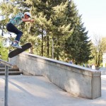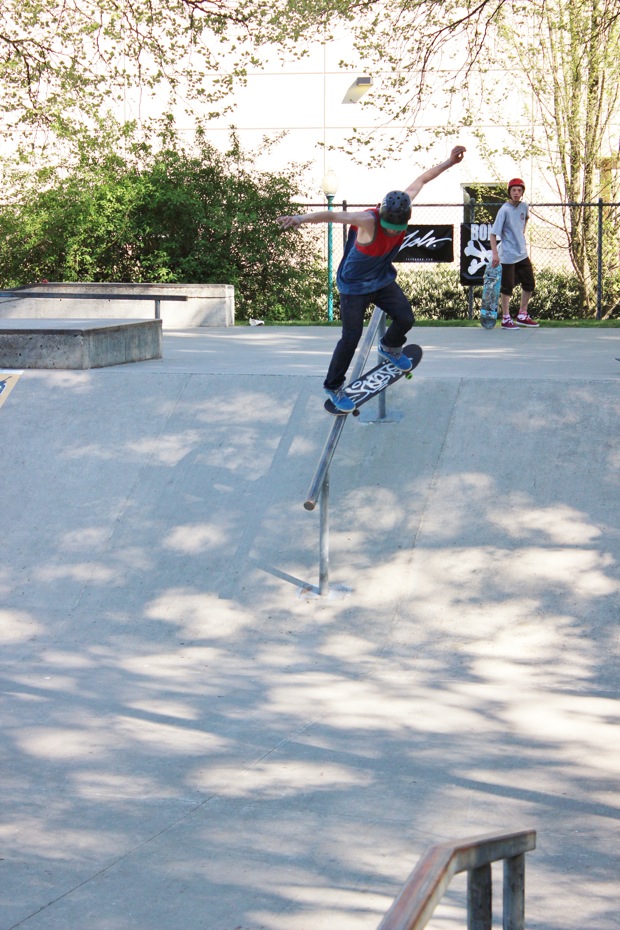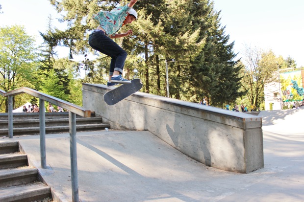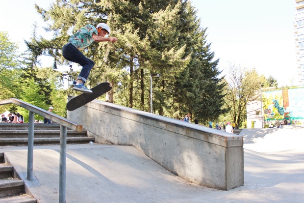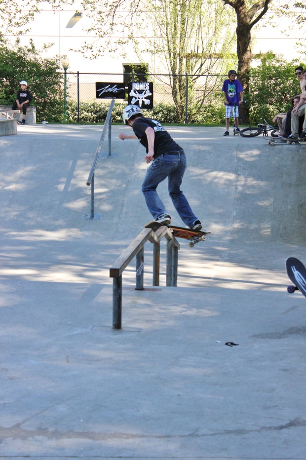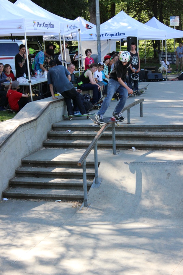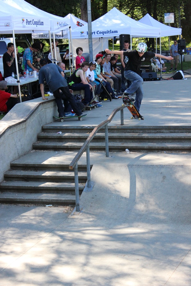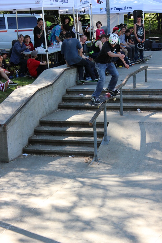 I don’t have too much to say about this Poco contest except it was really well done. Giver, or as he likes to be called – Michael James – put it all together with the City of Port Coquitlam and did a great job organizing it and running it. All the kids had fun, they all felt good even if they didn’t win, and there were no negative vibes. Rippers of the day were Lukasz Brodowicz, Parker Sherwin, Aiden Eastman and little Presley from Squamish who all destroyed it in the 9 & unders; Kyler, Jonathen and Mathew McCauley took the prizes in 10-13’s and the 14-18 category was untouchable. Fighter was killin’ it for Protest on his last day as an 18 year old, but also almost killed himself a couple times slamming straight to his side on flat from the top of the big handrail, but he still Benihana’d the 9 stair and the Double Set, Gap to Front Tail up the step up rail, and crooked the nasty rail down the big bank. But he didn’t place Top 3.