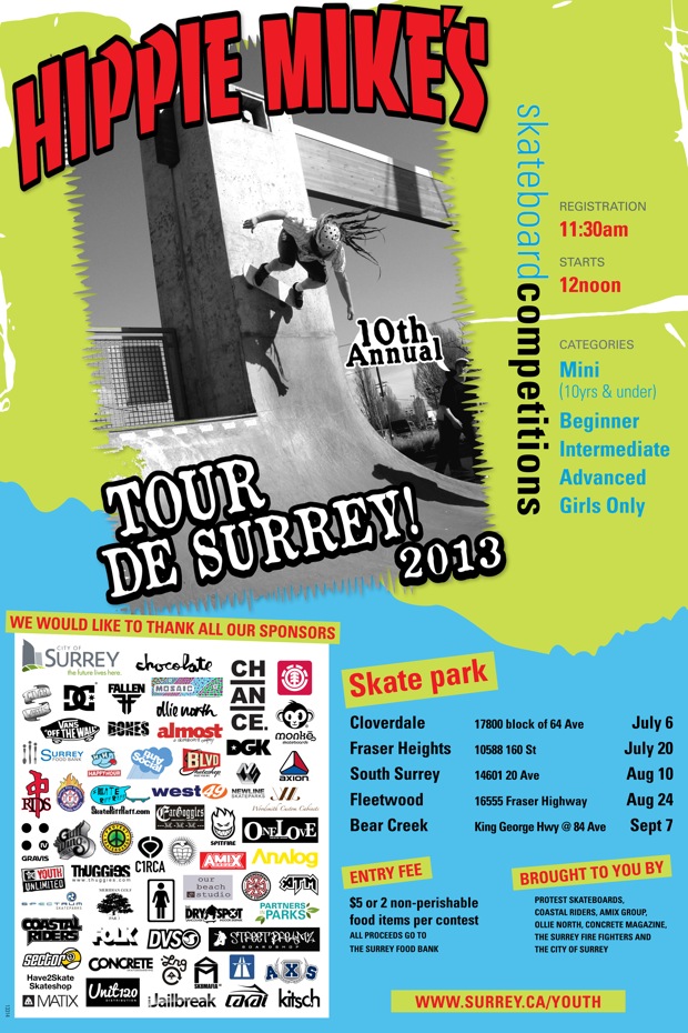 It is almost time people – the 10th Annual Hippie Mike’s Tour de Surrey starts on July 6th at Cloverdale Skate Park on 64th ave. This series of events is a huge part of my life, and the lives of many kids in Surrey, Delta, Langley and wherever else they travel from for the comps. It melts my heart to recognize the joy that I have brought to so many individuals over these last 10 years by running this series. It all began in 2004 with me asking the question to someone in Parks and Rec “What do I need to do insurance wise to be approved to run a series of skateboard competitions in Surrey?” This began a conversation throughout the Youth Functional Table and came back to me with an answer of “Why don’t we partner with you and make it a City run Event…” I said sure, and look where we’re at – 10 years later…