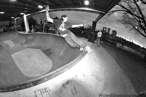 The BMX Contest ran as a Jam for about 40 minutes in between the qualifying runs and Finals for the skateboarding and most people were patient enough during that time, but the real deal was the skate comp. 4 Categories – 9 & under, 10-13, 14-18 and 19 & over, and all 4 of them were stacked. The 9 & unders all ripped as hard as they could, with Emmanuel N. Busting an ollie down the 3 block at 8 years old, and 7 year old Django Caseley putting on a knee boarding demo. The 10-13 yr old category was intense. JR Barron, Mathew McCauley and Adam Lewis all destroyed it – ledges, rails and tech tricks over every gap there. The 14-18’s was dominated by Fighter (Brad Muscat) and The Dominator himself – Dominic Devries. Gabe Dinorscio was there but had to leave before the finals, it would’ve been nice to see how he would have fit into the winner’s circle if he had been able to stick around. And then there was the 19 & over category. Francois LeBlanc was on his ledge game for sure, but so were Yuya Ishikawa and Calvin Dignard. Allen Handley and Eve Feaver also made finals for killin the tranny, but Nothing was stopping Calvin form winning that one.