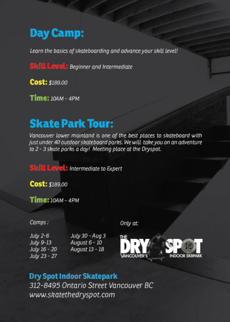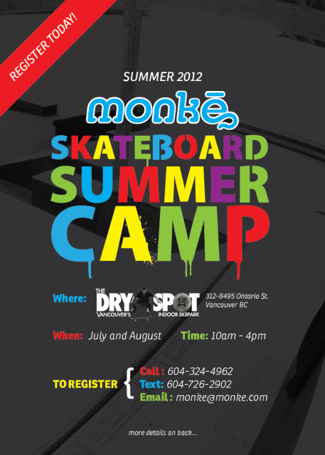 Now this sounds like an amazing opportunity for the skateboarders of the Lower Mainland to experience a whole bunch of skate parks that they might not usually be able to get to. An awesome way to spend a week out of your summer. Plus I think you get to hang out with Ben Chibber, owner of Monke Skateboards, The Dry Spot, and one of Vancouver’s skateboard legends…