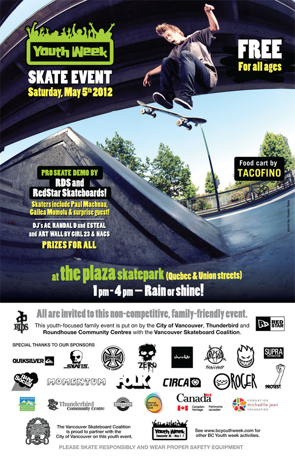 On Saturday, May 5th 2012 there will be a Pro Skate demo by RDS and RedStar skateboards at the Plaza skatepark in Vancouver. This skateboarding demo is family friendly and is free for all ages.
