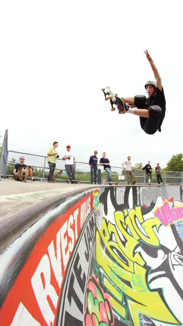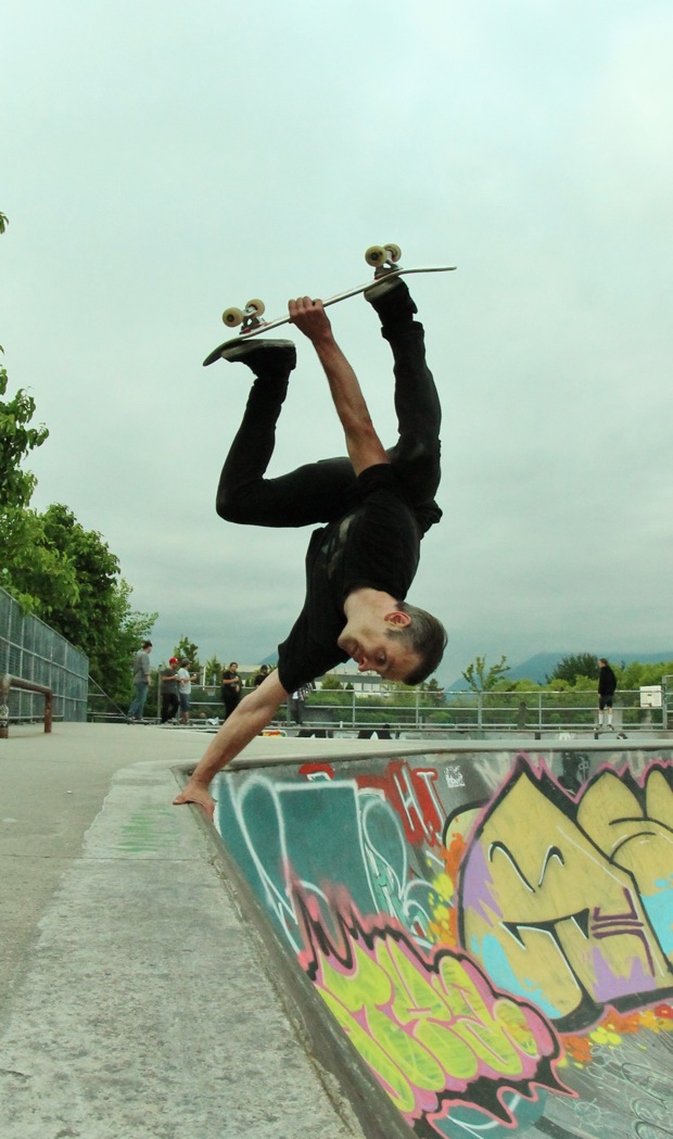 Then off to Hastings bowl we went. This was way more mellow with The Vans BBQ and a bunch of bowl shredders of all ages drinkin’ beer and chillin’ out. Andy displayed some fresh lines that he’s got going on, and Frontside Kid James Clarke showed how fast he could go and how big he could stalefish in the deep end of the bowl. Chris Macallum, Chris Timmers, Surrey Stu, Sheldon Barr, Baxter, Adam Richter, Jeff Muirhead & Jonny B along with many others were going hard in the bowl, but the highlight of the night came when Chris Steggles pulled his skateboard out of his trunk to shred. Steggles said he hadn’t skated yet this year, but it didn’t show once he rolled in – long grinds, vertical handplants and he even aired over the fence out of the 4 foot a few times. Steggles is the man, and he made the day awesome…