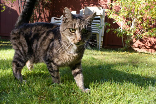 Shithead was a cat who lived at the house we bought in 2005. She was energetic, and always happy and loved to snuggle. She lived mainly outside, but would spend the winter nights by the fireplace. Approximately 11 years old, she was diagnosed with Kidney Disease, Hypothyroidism, Diabetes and some blindness in May of this year. We worked hard together to bring her health and strength back so she could enjoy one more beautiful summer in Surrey. Unable to gain any weight back because of her failing kidneys the winter cold was just too much for her. She is now buried between the fruit trees on the edge of the ravine in our yard, where she always sat to enjoy the sunshine peaking through the trees.