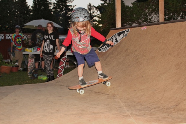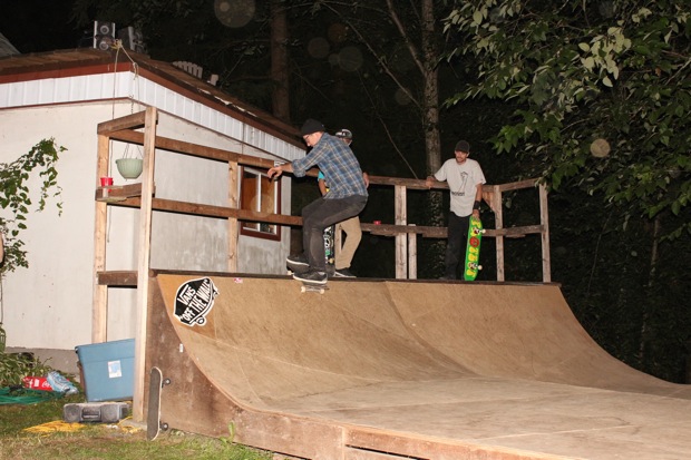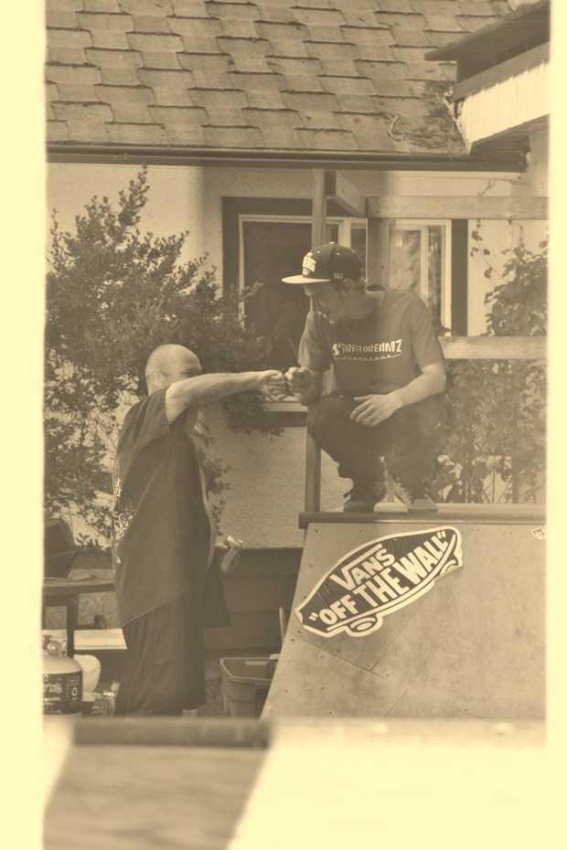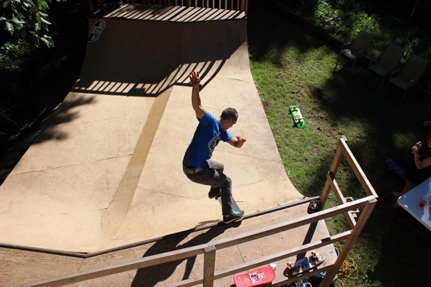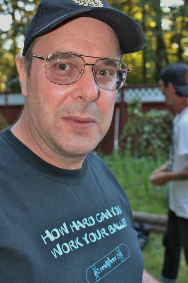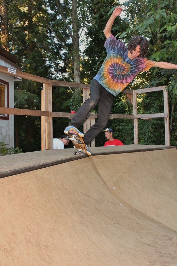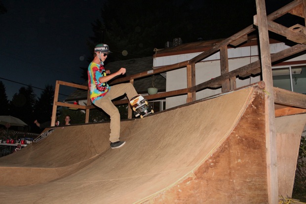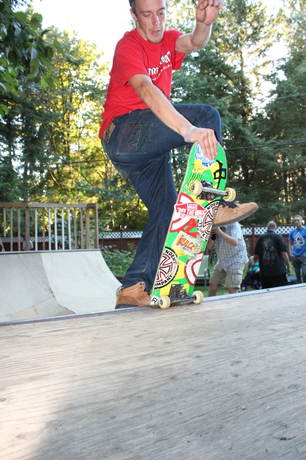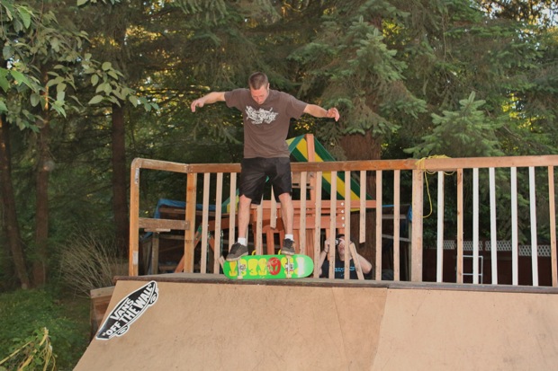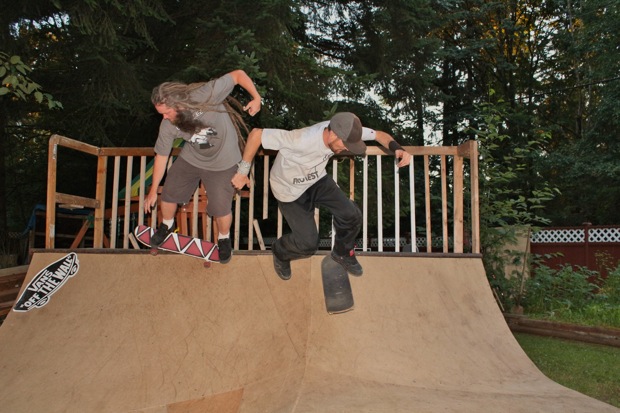 Everybody had a good time and we all just hung out having fun. There was ladder golf for the kiddies and mini ramp for the big boys, and plenty of food for everyone. Homer was the BBQ master again, and one my old friends from high school in Ontario, Ray (Turner) Fox showed up to hang, and Dennis Regan was in the house as well. The ramp was kind of the highlight area of the party and it seemed like everyone was on there game – Cisco Gooding was dropping 270’s out of every type of grind all over the ramp, Fighter learned yet another variation of Judo Blunt by popping them to frontside tail, Jaden Easton-Ellett was slashing everything super fast and stylish, Randy Madland was hitting primo stalls out of 50-50 and then landing them back in, Giver (Michael James) was going frontside like usual, and Justin James skated the entire time and probably took the most body slams of everyone, in amongst landing a ton of tricks. I jumped on the ramp for about 10-15 minutes for a doubles photo and video of me 5-0 grinding the hip over Justin doing a bigspin going the opposite direction. That was about it for Hippie Mike‘s skating on this day both my legs were super cramped up from the day before. Later in the evening Jeff Cole and Andy Anderson strolled in and of course both got up on the ramp for a “fresh legs demo”. Jeff is injured right now so he was taking it easy but still slashing with style, and Andy had just come from an all day Freestyle Demo out in Maple Ridge so he was on top of his game, and itching for tranny. He threw down a couple perfect nosegrinds over the hip and Jeff called him out to do nosegrind on the first side and then revert into sugarcane as he transferred the hip. It took Andy a whole 2 tries to stick it and then he did like 3 more in a row. All these guys are great to watch skate mini, and that was pretty much all we did. Food was good, drinks were good, weather was good and the people were awesome.
