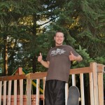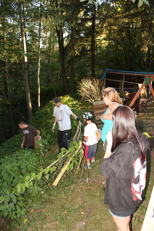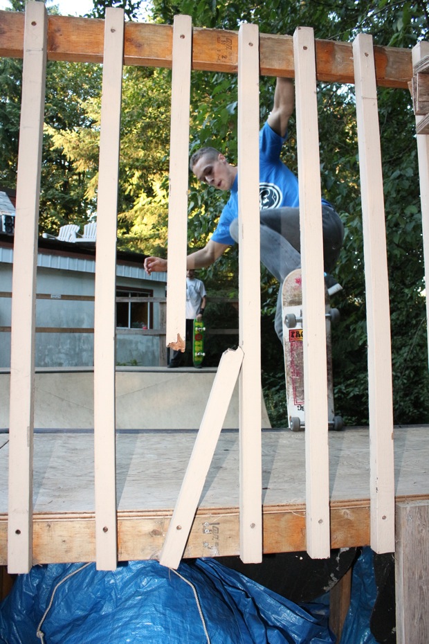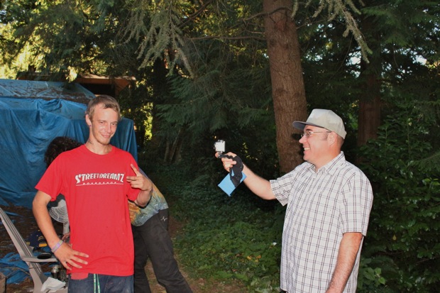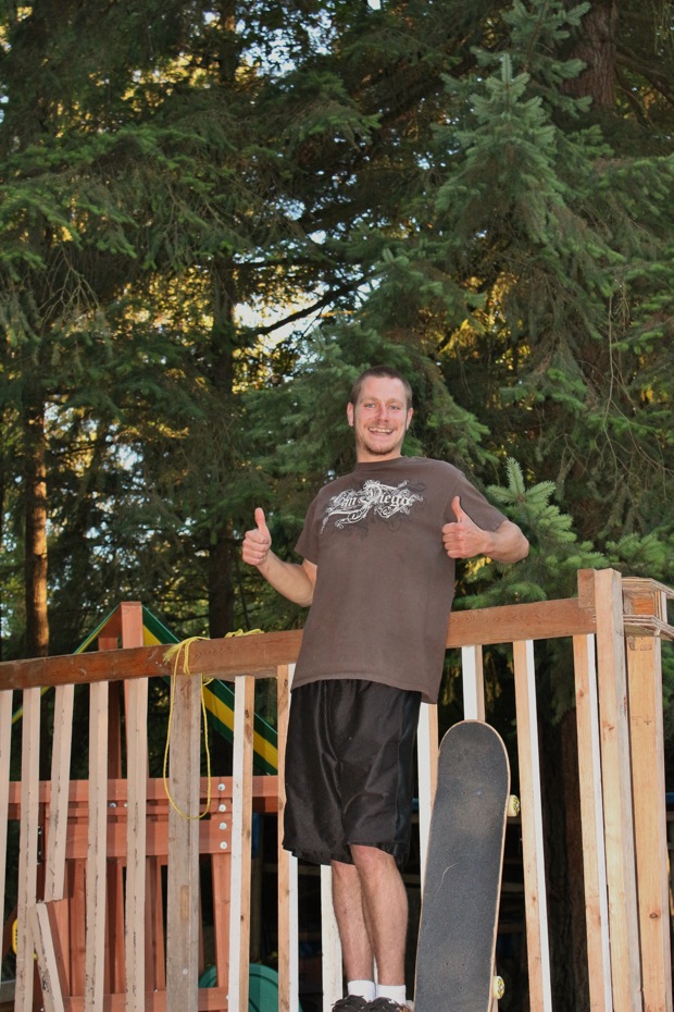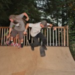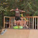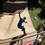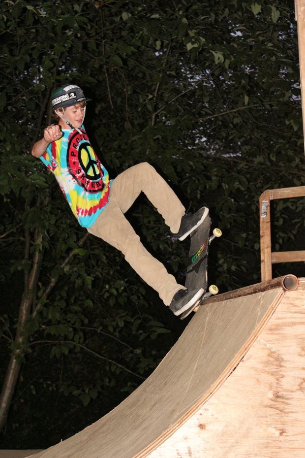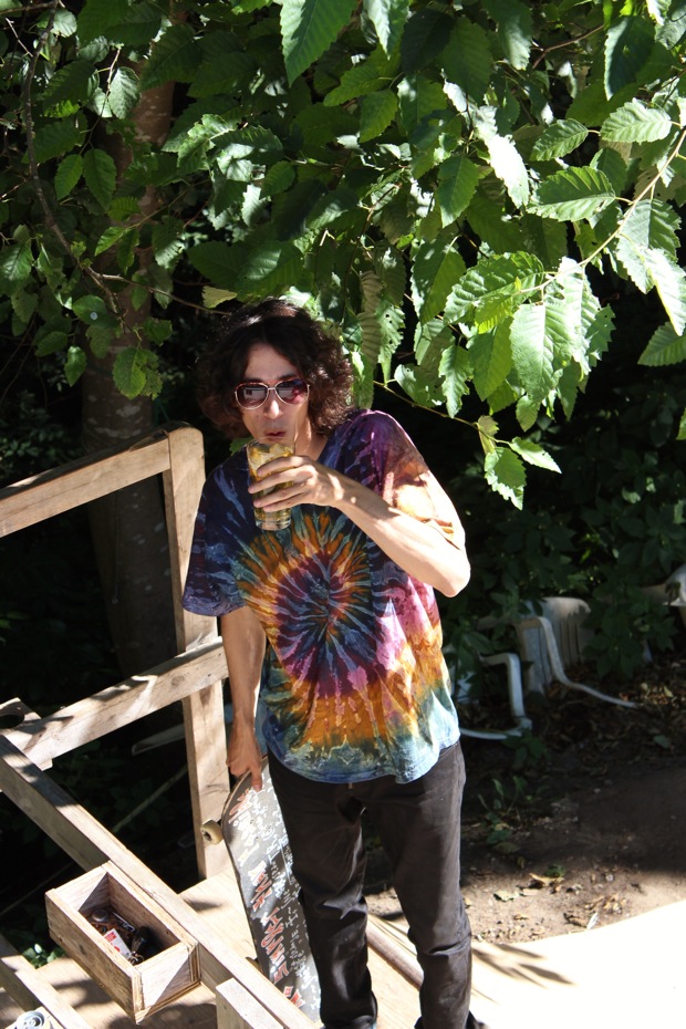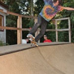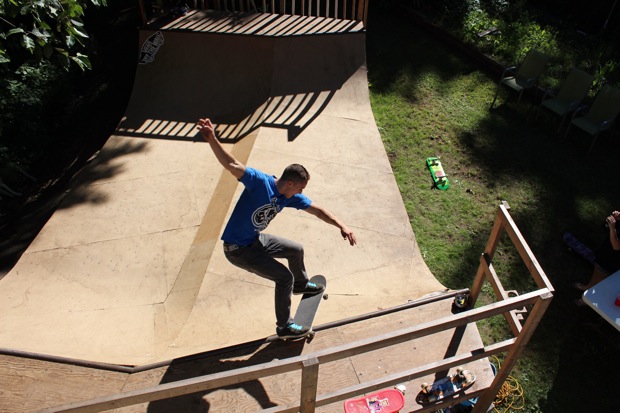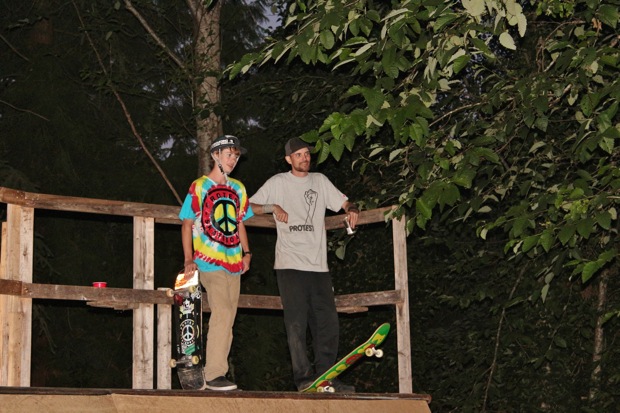 Everybody had a good time and we all just hung out having fun. There was ladder golf for the kiddies and mini ramp for the big boys, and plenty of food for everyone. Homer was the BBQ master again, and one my old friends from high school in Ontario, Ray (Turner) Fox showed up to hang, and Dennis Regan was in the house as well. The ramp was kind of the highlight area of the party and it seemed like everyone was on there game – Cisco Gooding was dropping 270’s out of every type of grind all over the ramp, Fighter learned yet another variation of Judo Blunt by popping them to frontside tail, Jaden Easton-Ellett was slashing everything super fast and stylish, Randy Madland was hitting primo stalls out of 50-50 and then landing them back in, Giver (Michael James) was going frontside like usual, and Justin James skated the entire time and probably took the most body slams of everyone, in amongst landing a ton of tricks. I jumped on the ramp for about 10-15 minutes for a doubles photo and video of me 5-0 grinding the hip over Justin doing a bigspin going the opposite direction. That was about it for Hippie Mike‘s skating on this day both my legs were super cramped up from the day before. Later in the evening Jeff Cole and Andy Anderson strolled in and of course both got up on the ramp for a “fresh legs demo”. Jeff is injured right now so he was taking it easy but still slashing with style, and Andy had just come from an all day Freestyle Demo out in Maple Ridge so he was on top of his game, and itching for tranny. He threw down a couple perfect nosegrinds over the hip and Jeff called him out to do nosegrind on the first side and then revert into sugarcane as he transferred the hip. It took Andy a whole 2 tries to stick it and then he did like 3 more in a row. All these guys are great to watch skate mini, and that was pretty much all we did. Food was good, drinks were good, weather was good and the people were awesome.