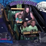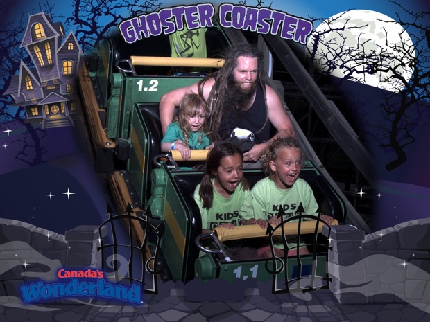 Wednesday seemed like a great day for Golf so Doug, myself and Carrie’s Dad Dave hit up this course called Pine View, which we had played last year as well. A lot of hills, and a lot of bushes. We got ‘er done and survived the heat, and found more balls than we lost. Somehow Dave won, and I think he mentioned that in his speech at the Milestone Party. Thursday had been set out as the Canada’s Wonderland trip with all our nieces and nephews, and Kaelen was stoked to see all his cousins and go to this huge park. Being the crazy guy that he is we made sure he got a blue wristband so he could hit certain rides, even though he came up about a 1/2 inch short for it. The first thing we did was take him on the Thunder Run a roller coaster that shoots through the mountain in the dark. 1st roller coaster – successful, so then later on in the day we had to get him on the Ghoster Coaster, one of the oldest wooden roller coasters around.