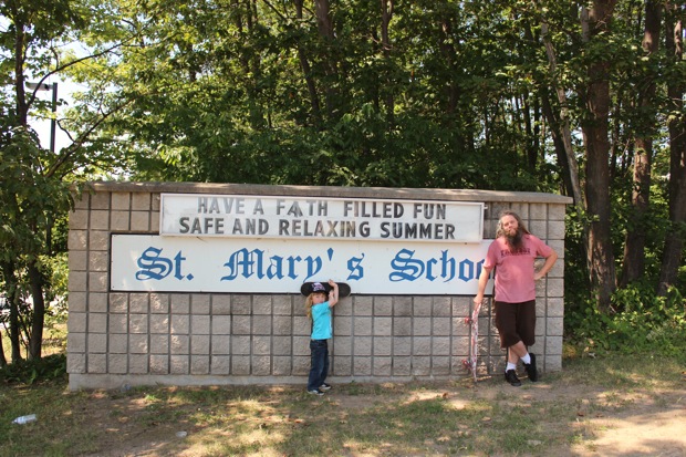 Me and Creelove dominated the game of ladder golf until the wee hours of the morning, and nobody got hurt. It was great to see everyone. The next day the same type of get together happened at my Mom’s house, but with about 100 less people. It’s hard sometimes to live so far away from all of our immediate family, and although we love the family we have created in BC, it’s always a nice treat to be bombarded with the originals. The night at my Mom’s ended with 3 1/2 year old Kaelen busting out his skateboard in the driveway and putting on a full demo. I grabbed the video camera and got this rare event on film, drop ins, fakie rides and he even landed a sweet primo stall. It was great to see him on his board showing off again, it’s been a while. On Tuesday before we headed back home we stopped by the old stomping grounds of St. Mary’s Elementary School and Kaelen continued to go for the gusto.