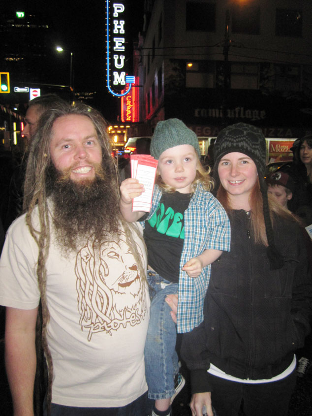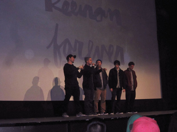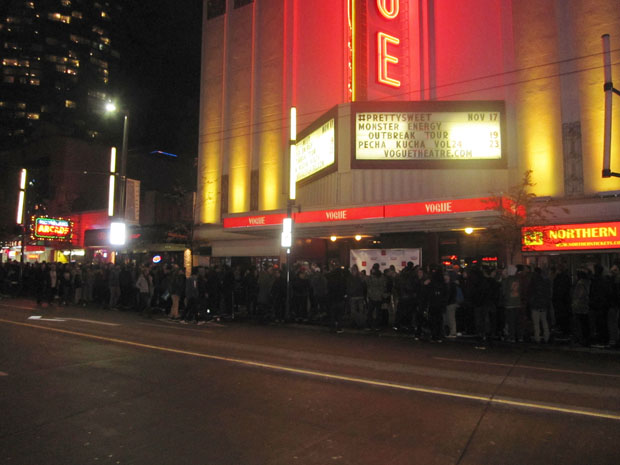 There were hundreds and hundreds of people lined up down Granville Street and around the corner waiting patiently in hope that the tickets they got weeks ago were gonna get them in the front doors. The theatre filled up quickly and the rowdiness began. I think I saw Dave Stevens pouring beer on to Majed Salem from the top deck. There was a couple firecrackers that went off and of course a huge poster sized paper airplane went flying by. Just another event in Downtown Vancouver, but at least nothing was smashed, flipped over or burned at this one. Once again the skateboarders, who are judged as the crazy ones, and the bad boys of the world, look better than the Local Sports Fans.