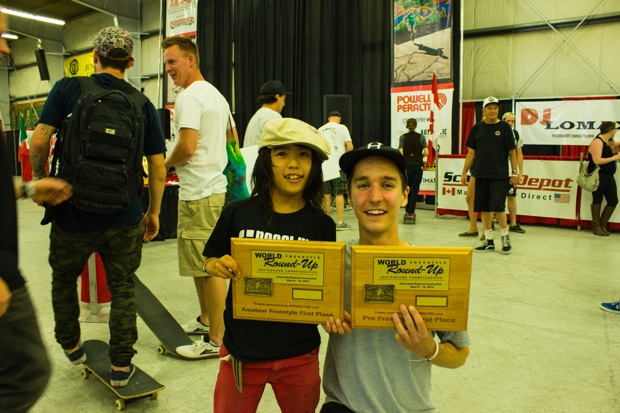 After the first 2 days of the 3rd annual World Round Up Freestyle Championships it is no doubt that this year has the craziest skating going on. With a flock of new Amateurs and a couple old time Pros showing up it is definitely different from last year. All the competitors are stoked to be in Canada again, or for the first time for some, and the positive vibes fill the room. This year’s highlights include a barely 11 year old prodigy child from Japan named Isamu Yamamoto who so far has been blowing away the audience as well as the judges with his pure skills and straight confidence, he is a natural skateboarder and showman for sure. He will be heading into the Finals in 1st place position and will be trying his hardest to continue his successful runs and finish on top of the Amateur division. Right on his tail though is local boy Andy Anderson who is trying a little harder in this his 3rd year at the event. Last year he finished 3rd in Amateur and I’m sure he wants to keep it in the top 3 again. Andy’s skill level, creativity and consistency is awesome and gets all the other competitors excited, especially the Pros.