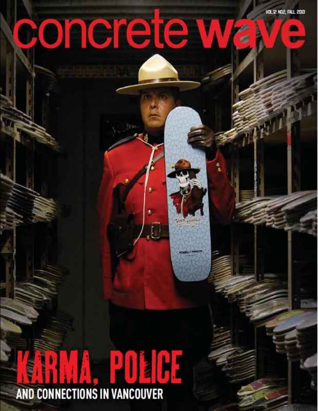 Somehow I always end up being part of historic events and this is truly one of the most historic articles that has ever been published in a skateboard magazine. It started out at World Round Up contest last May while I was interviewing Freestyle Skateboarders for the website and a cop in full uniform came up to me and asked if he could ride my skateboard. I said sure and handed it over. He was with another officer that I knew from working in the City of Surrey and he let me know that he worked closely with my events DJ Jordan Wiebe all the time and knew all about me. I’m not sure if I was more impressed by that statement or the fact that he jumped on my board in full uniform and started manualling and popping ollies and nollie 180’s. My first thought was “Jesus, don’t let him fall on his gun…” but my second thought was “Who is this guy?” I was straight up surprised and he pulled up his sleeves showing me that he was pure to the core with a Skull Skates tattoo on one arm and a Kevin Harris Mountie graphic on the other. Right away I called Kevin over and got them to pose for a photo. Little did I know that photo was going to make history. When Michael Brooke from Concrete Wave Magazine caught a glimpse he was instantly attracted and wanted to know more and it ended up becoming something amazing. Kevin and Troy started hanging out together and conversing about so much life and we all realized that there had to be an article to teach that cops and skaters don’t have to separated anymore, and show the world that they can actually unite and be one. When I grew up I was a cop hater in my own senses and part of that came from being a pure street skater and having to deal with them on negative terms all the time, but another part came from always being prejudged by the police by my appearance and believe me I have been through some serious uncalled for harassment from these so called “Peace-Makers”. I hated on Police for a long time and always dealt with any situations myself instead of ever calling on them for help. My opinions of cops changed when I started working with the City of Surrey Parks and Rec and worked tightly in the community. I started meeting all kinds of members and found out that some of them were into being police officers for different reasons than just going out there and throwing there weight around. Some people become cops to work in community development and support those who need help and put all their concentration and focus towards providing positive opportunities for kids and other people in need. I’ll always be weary of Police because of the way I grew up but I learned over time that they aren’t all bad, and cops are people too. So this was a great experience to see a cop who had skateboarding in his blood and still itched for it, and once I knew there was going to be an article about it I couldn’t wait to read it. The crazy part about it was we were totally focused on the aspects I had just talked about – a cop that skateboards, and how skaters and cops can get along, and just all about the persona – but the article turned into so much more. As Officer Troy Derrick began to spill his guts to Michael Brooke about his upbringing and the abuse he went through as a kid and the hard times he lived out growing up as a First Nations person he kept coming back to one thing – skateboarding. Skateboarding basically kept him alive, and kept him happy through the toughest of times, and no matter where he went and how he got there all he cared about was his freedom to skate. This tear jerking story that Troy wrote sparked some serious memories in Michael Brooke and he began to write his story of how skateboarding guided his life to where he is today,  and that created a whole new article involving so many amazing Canadian Legends who all had one thing in common – they found a skateboard to be the key to a successful and happy life.