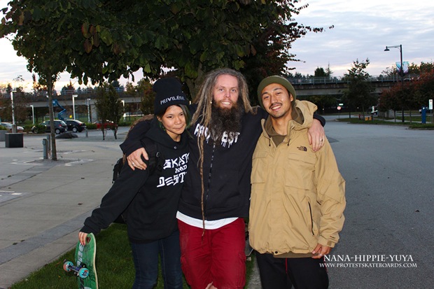Earlier this year I was on Facebook and saw a photo of one of my distant friends Yuya Ishikawa posted and he was at the Plaza and I wasn’t sure if the photo was recent or not. I new Yuya from a visit he had made in the past to BC but knew he was back in Japan. Next thing I knew Bam, there he was at Chuck Bailey Skate Park the very next day. I was so stoked to see him as he is such a rad dude, and sick ledge skater. Yuya had a girlfriend with him named Nana Kunugi and she was very happy to meet me. I gave them both Protest Stickers and told them to check out the website as there were lots of upcoming events that I was posting about and wanted to make sure they knew about them. These 2 hardcores started coming out to every event I was running in Surrey, they would bus all the way from North Burnaby out to Cloverdale or South Surrey just to be a part of these events which takes hours, and I thought it was so cool. It showed how much they enjoyed the atmosphere at the events. I considered them real friends and was super happy at how much they appreciated the skate scene out here, so I would try to give them rides to save them travel time and they would come back to my house and hang out whenever they could. It is so great when you can overcome a language barrier and still just hang out with others because you have things in common. So many people visit here from Japan to skateboard and they are all so amazing, super friendly and inspirational. We had some great times this summer together and created some awesome memories. Now these 2 friends will be flying out of Canada on Monday to spend a year in Australia and I wish them the best. I know I will miss seeing them around.