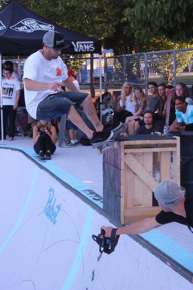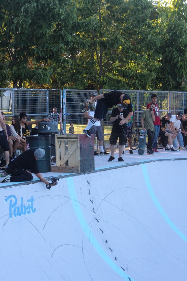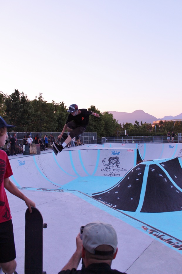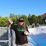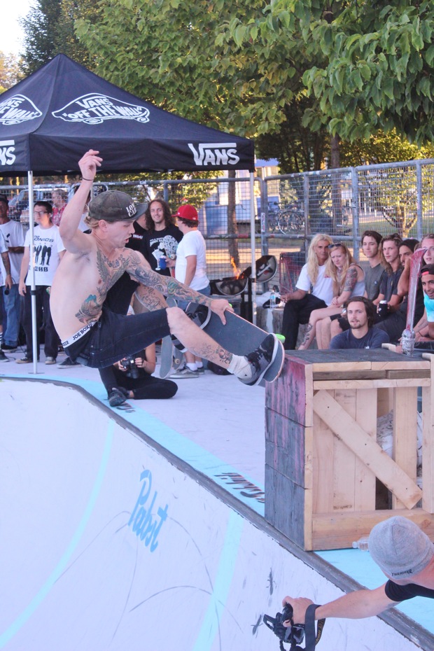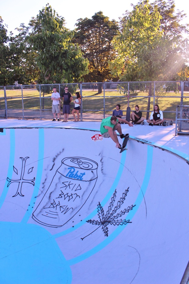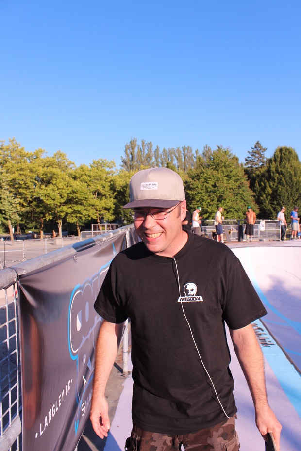 This company is focused on promoting skaters that are teens and children only. They are hosting competitions for kids 13 and under in 5 different countries this summer, and have created a magazine that will be hitting the shelves in the matter of weeks. Sean drove up from Toronto to meet me for the first time as we had been talking over the phone and by email for a while. We discussed a bunch of opportunities for us to collaborate, and it sounds like I will be writing for their magazine, along with some other amazing things. It was a great lunch meeting a Moose Winooski’s, and I had my oldest nephew Riley Robinson with me to be a part of this new venture. I look forward to being a huge part of this new Top Grom era. After the meeting, there was really only one place to go – the Barrie Skate Park. I remember it took years of meetings and petitioning and a bunch of work to get that skate park built back in the 1990’s, and they ironically finally put it in the year after I moved away to BC. So I’ve only ever skated it a few times, but I know which obstacles I like there. I’m still recovering a strange injury I had in the middle of June when I jammed my ankle at Seylynn, so this was the first time I had skated anything but tranny in a while. You could tell – my pop wasn’t poppin’ and my flips weren’t flippin’, so I tried to stick mostly to this weird rising quarterpipe they have there. The design of the Barrie Skate Park isn’t that bad, but the concrete job is terrible filled with lumps and bumps all over that shouldn’t be there. I really don’t like flat banks that are steeper at the bottom than at the top… I only filmed this 1 trick there, body varial noseblunt near the top of the quarter, and it wasn’t easy. Plus pushing as hard as I could across the entire park in 35 degree sun doesn’t help, but I did skate Bear Creek and Confederation Park for many years, so I know how to handle it. Thanks to the local kid Dylan for filming it.