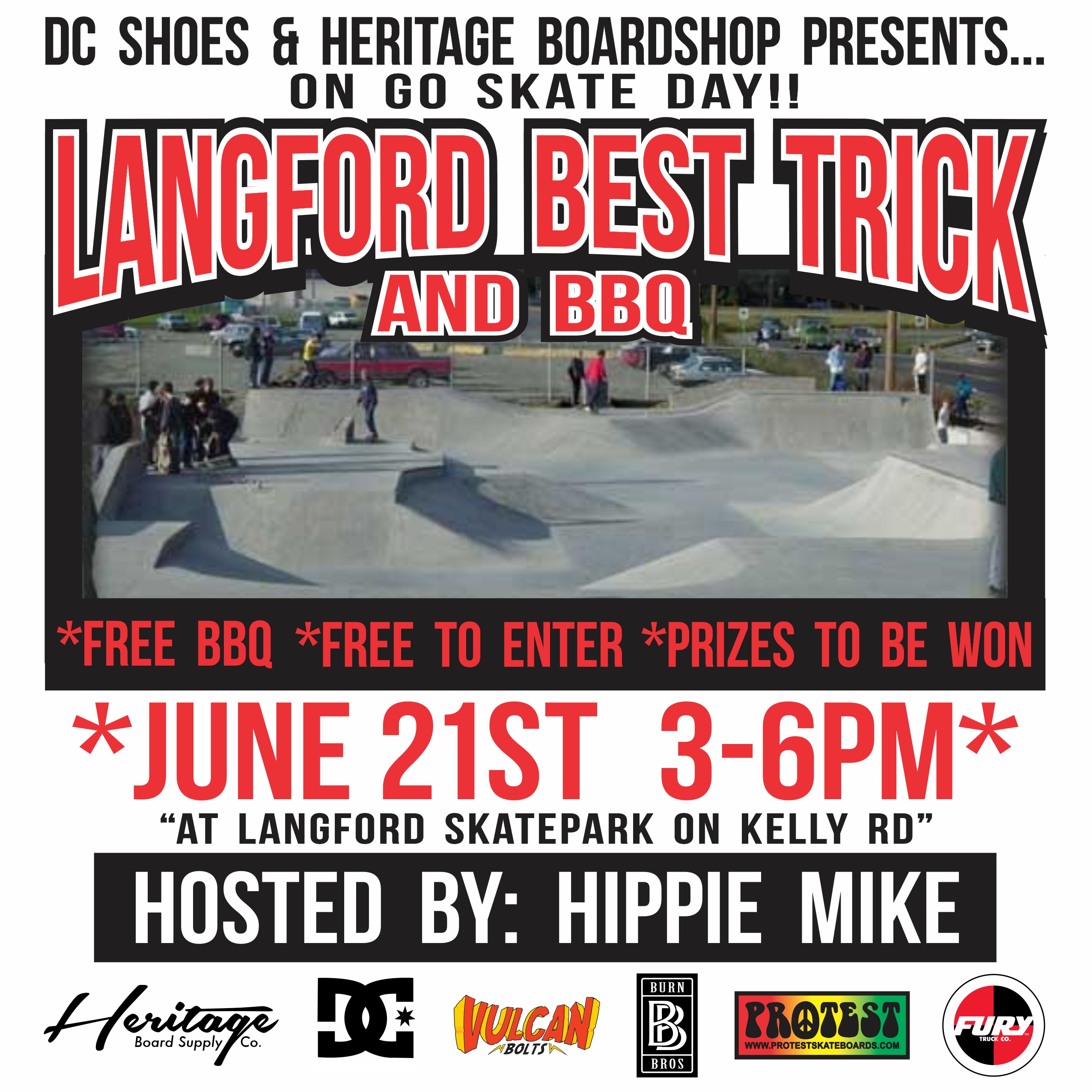 With the Westshore Skate Park at risk of being removed sometime this summer, Hippie Mike figured it was a good time to head over to Langford and do something special at the park. Join him this Sunday on Go Sk8 Day as he works alongside Heritage Boardshop and DC Shoes to host a Best Trick Contest and Free BBQ for all the islanders in Langford, BC.