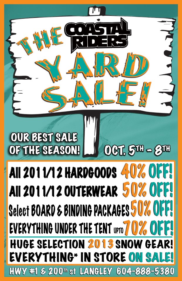Coastal Riders is their biggest sale of the year this weekend October 5th-8th. Everything in the store is on sale, including Hard Goods, Clothing and Outerwear, and tons of fresh snowboard gear.