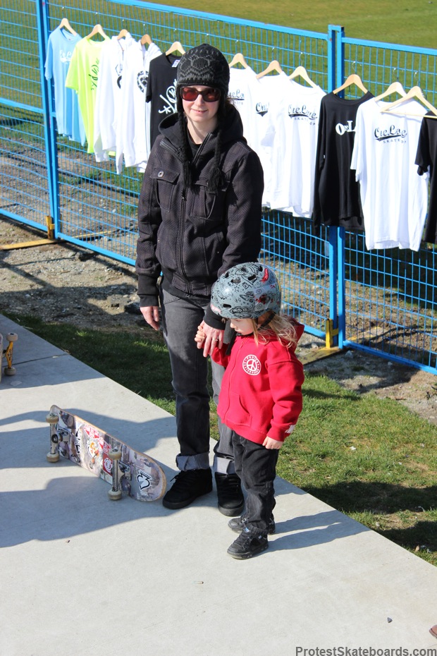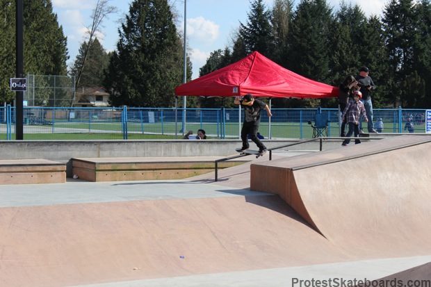 It was one of the first big contests of the 2013 season, and Dan Pageau couldn’t have chosen a better date. The Spring Kickoff Contest at Pitt Meadows lived up to it’s name by being on a beautiful Spring Day, and the day the clocks move ahead. Tons of kids showed up, lots of Locals for Pitt Meadows and Maple Ridge, and lots of the One Love Skate Shop Crew. Lanny Deboer and Andre Tsougrianis both hung out and skated a bit, Lanny won the highest air contest out of the bowl, and then MC’d a bunch of the contest. But we had a full sized crew show up from Surrey and Delta, including Jordan Strong, Brendan Nielsen, Ryan Barron, Jacob Drescher, Mathew McCauley, and JR Barron, along with Hippie Mike, Carrie Williams and Jaden Easton-Ellett with the Protest Skateboards Tent.