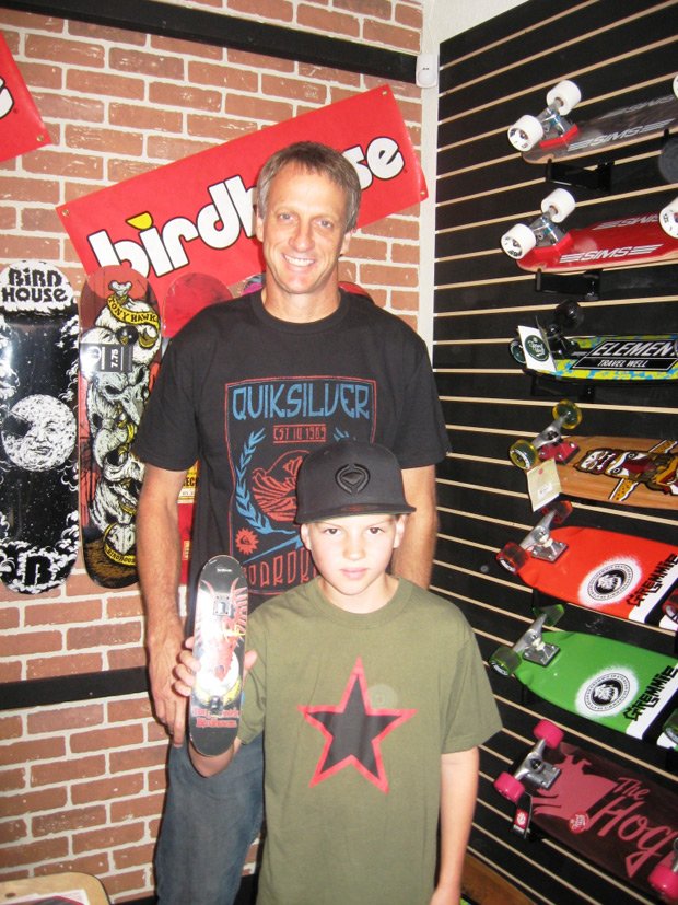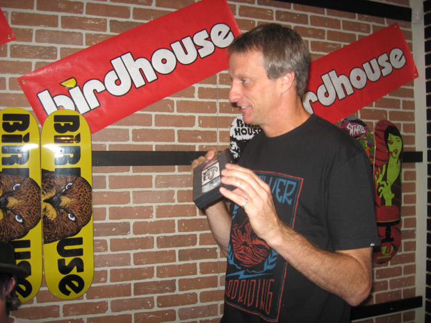 Quote Brad Sherwin – “He signed Parker’s handboard first, then the shirts, and I asked if he could sign one more thing. When I took the tape out of the bag, he wasn’t sure what it was. When he saw the top label, he said “You gotta be kidding!” He signed it, and asked if he could take a photo with it, to which I said of course. He pulled his phone out of his pocket, turned to one of the other guys on his team and asked them to take a shot for him. The other guys from Boulevard Skate Shop even said “Is that Ravers?”, and they got excited as well. Tony took the tape, made it look like he was biting it and got his shot. This shot was just after his was taken. He was excited to see it.”