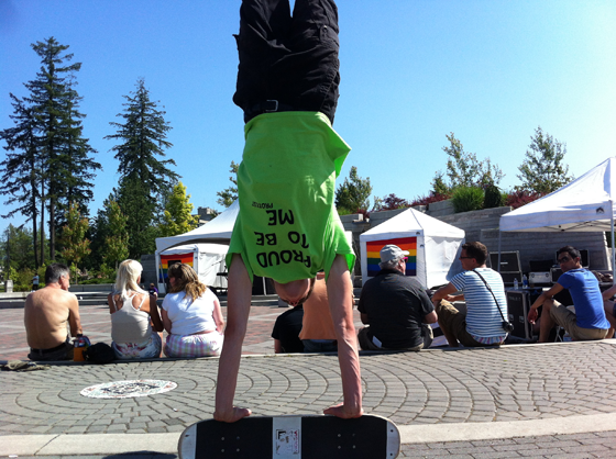 Well we sponsored the Surrey Pride Festival went as a vendor. There were tons of people there having a great time, it was super sunny and hot. The music was pretty good, I liked the first band – Goatface Killaz. They were pretty funny, and they were totally stoked when Ryan Brynelson walked up and threw down his board in front of the stage and started ripping it up Freestyle. Handstand kickflips, Pogos and Spins, and just Walking the Dog across the entire park, the crowd’s attention was suddenly turned to him and the band recognized it right away, calling him “Skater Guy” and giving him props over the microphone while singing their songs.